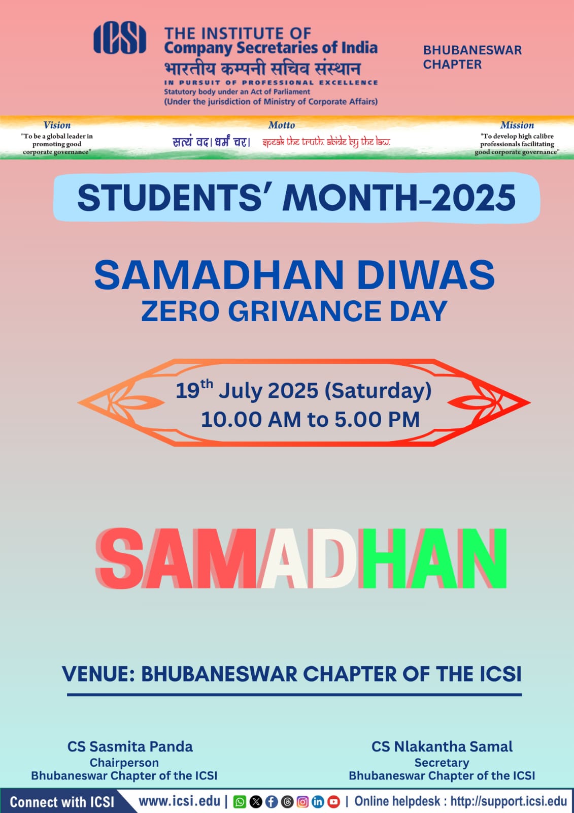 - Bhubaneswar Chapter Organizing- Samadhan Diwas(Zero Grivance Day) on 19th July, 2025 at Chapter Office Premises at 10.00 a.m to 05.00 p.m. All students are come to office for query Registration related/Training related or any other issue please contact Chapter Office. Contact Details: 0674-2552282/2551139/7978033845, bhubaneswar@icsi.edu
