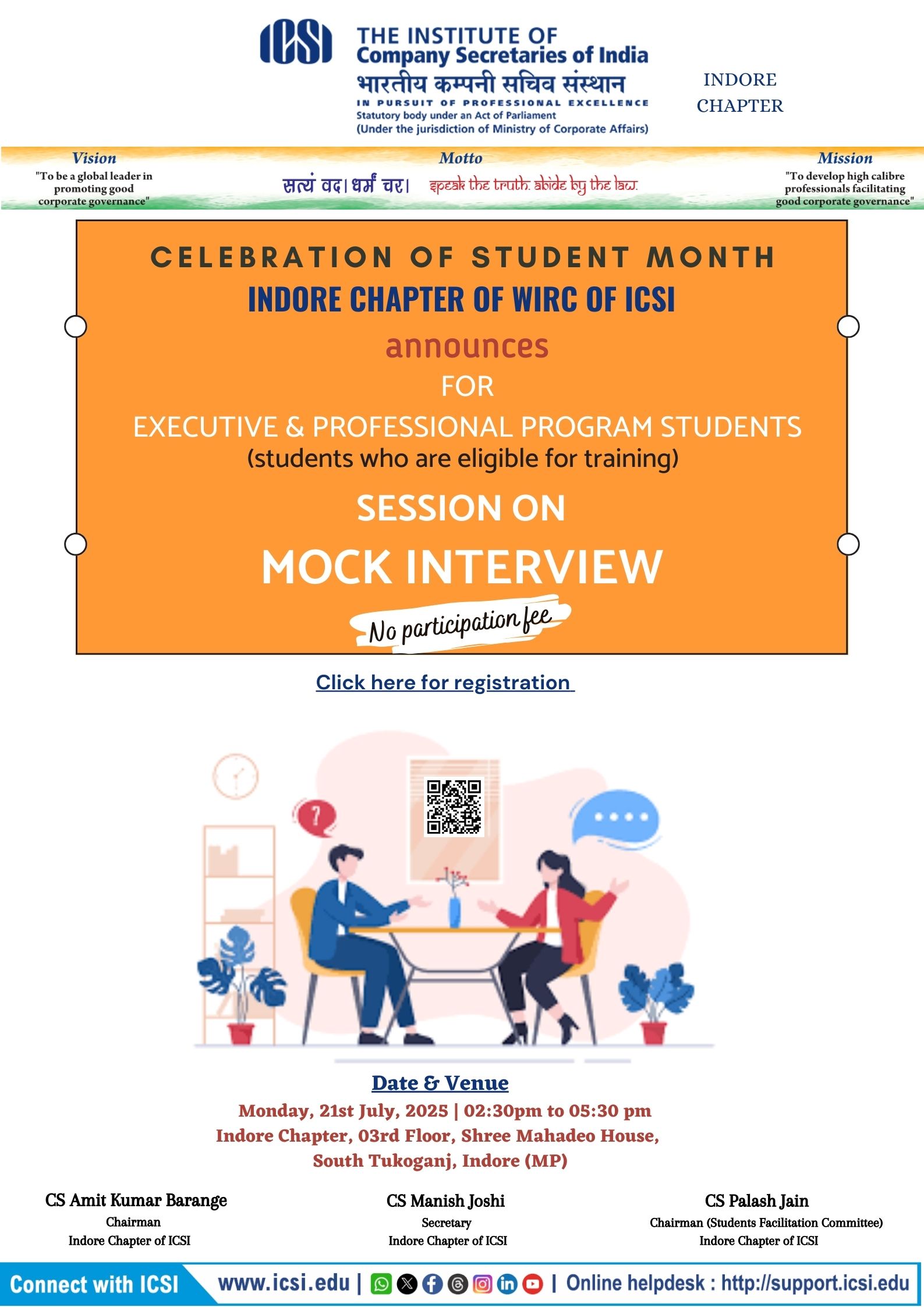 • Student Month is an opportunity for the students to interact with the Institute. The students have been enthusiastically participating in the various activities during the Student Month. In context to that Indore Chapter is organizing a session on "Mock Interview" on 21.07.2025. No. Fee. We encourage all students to participate and make the most of this enriching experience. Looking forward to your presence!