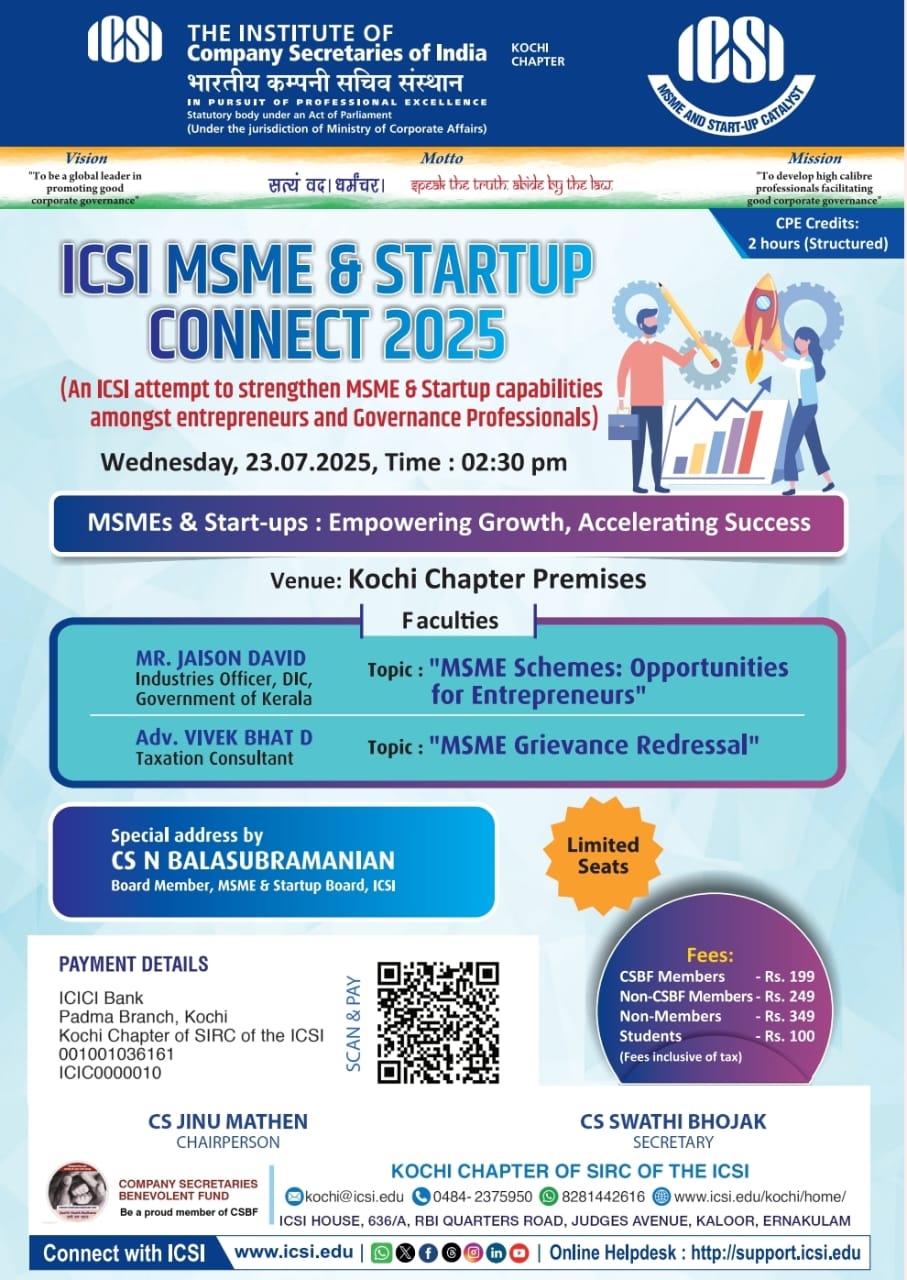 On the occasion of the MSME & Startup Connect 2025 celebrations by the ICSI MSME & Startup Board, we have the pleasure in inviting you to a programme on the theme "MSME & Start - ups: Empowering Growth, Accelerating Sucess" to be held on Wednesday, 23rd July 2025 at 2.30 PM at our Chapter premises.