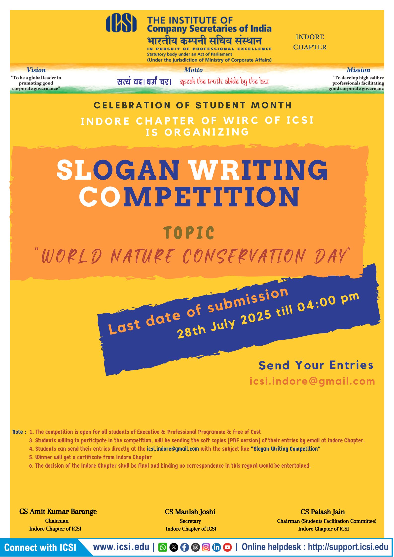 - Student Month is an opportunity for the students to interact with the Institute. The students have been enthusiastically participating in the various activities during the Student Month. In context to that Indore Chapter announced an "Slogan Writing Competition" on 28.07.2025. We encourage all students to participate and make the most of this enriching experience. Looking forward to your presence!