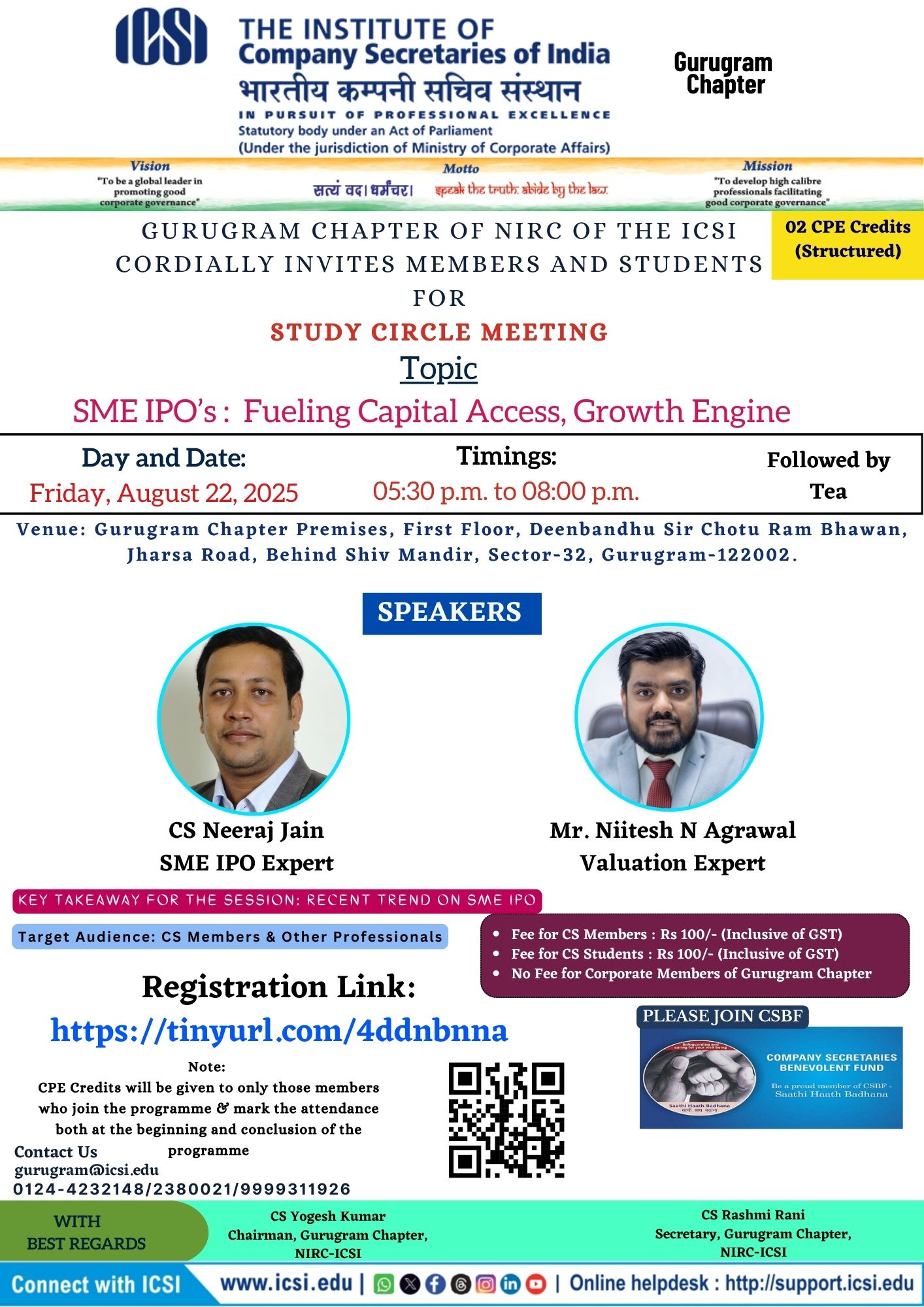 - Study Circle Meeting on Topic "SME IPO’s : Fueling Capital Access, Growth Engine "on Friday , 22nd August, 2025 from 05:30 P.M. to 08:00 P.M