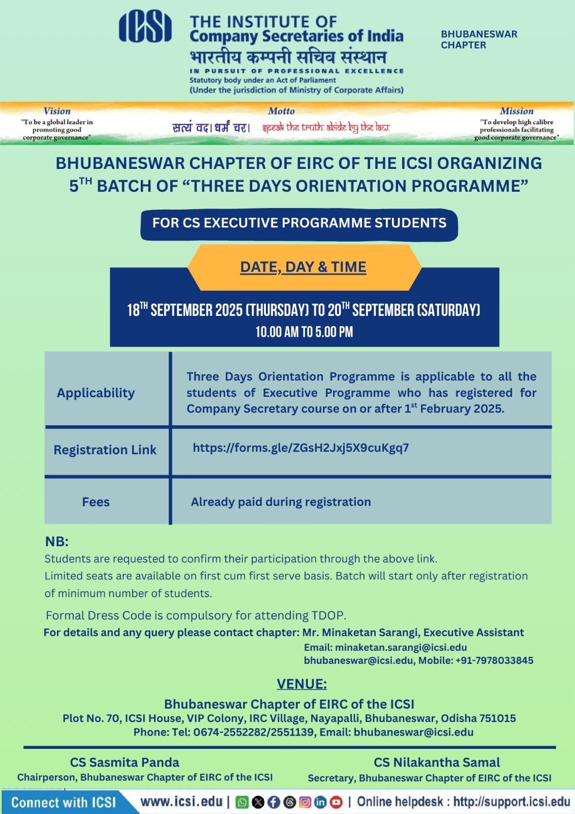 - Bhubaneswar Chapter Organizing - 05th Three Days Orientation Program (TDOP) will be held on 18th September, 2025 to 20th September, 2025 at Chapter Office Premises. 01st February, 2025 onwards to all Executive Program Students to attend the TDOP Class is Mandatory. Reporting Time: 09.30 a.m. For any query please Contact Chapter Office: 0674-2552282/2551139/7978033845, Or Mail to: bhubaneswar@icsi.edu