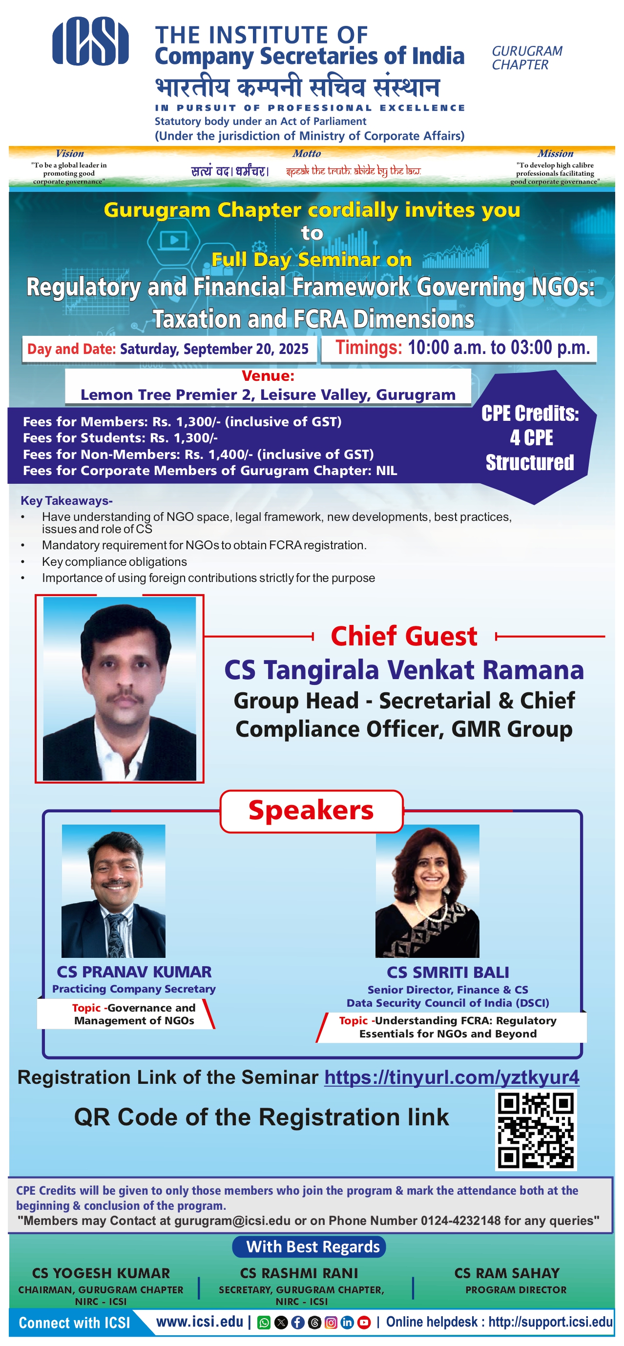 - Full Day Seminar on "Regulatory and Financial Framework Governing NGOs: Taxation and FCRA Dimensions" organized by Gurugram Chapter on Saturday, 20th September, 2025