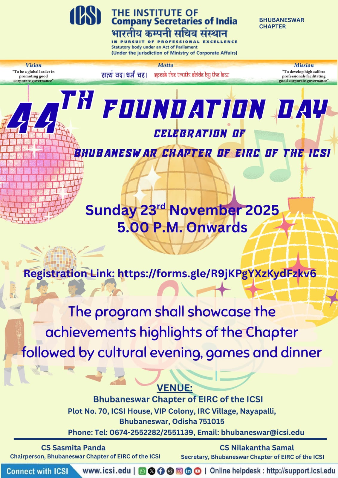 - Bhubaneswar Chapter of EIRC of the ICSI Celebration of 44th Foundation Day on 23rd November, 2025(Sunday) at Chapter Office Premises. All Members and Students to attend the program. For any query please contact Chapter Office: 0674-2552282 / 2551139 or mail to: bhubaneswar@icsi.edu