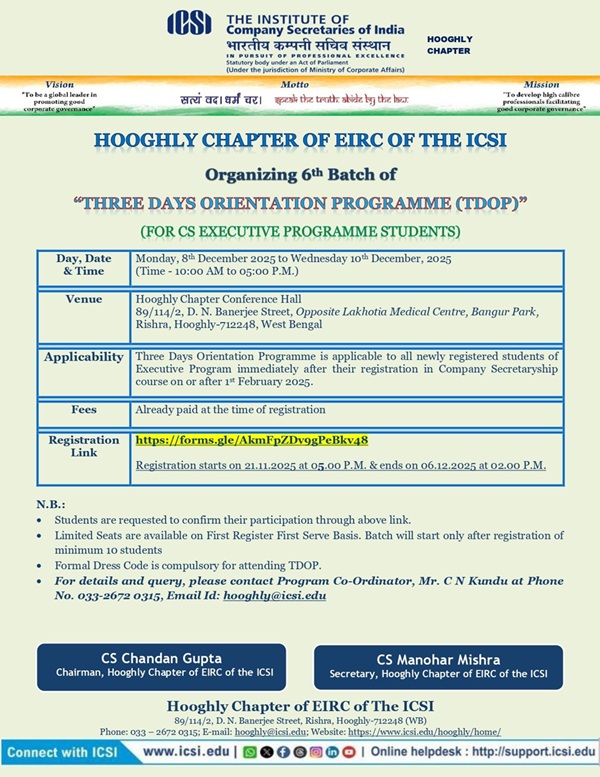 Hooghly Chapter's 6th Batch of Three Days Orientation Program (TDOP) from 08.12.2025 to 10.12.2025