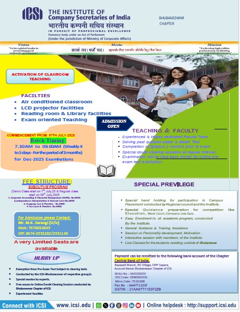 - Bhubaneswar Chapter Organizing- Classroom Teaching (CRT) will be held on 07th July, 2025 at Chapter Office Premises at 07.30 a.m onwards. All Executive Program Students to attend the CRT Class and a grand success. 07th July, 2025 (Demo Class) & 08th July, 2025 Regular Class start. Duration: 03 Months.
