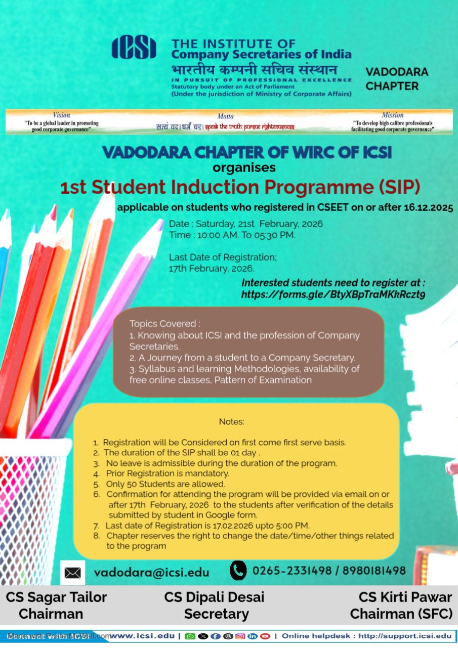 Vadodara Chapter organizes 1st Student Induction Program (SIP) on 21st February, 2026 (Saturday)