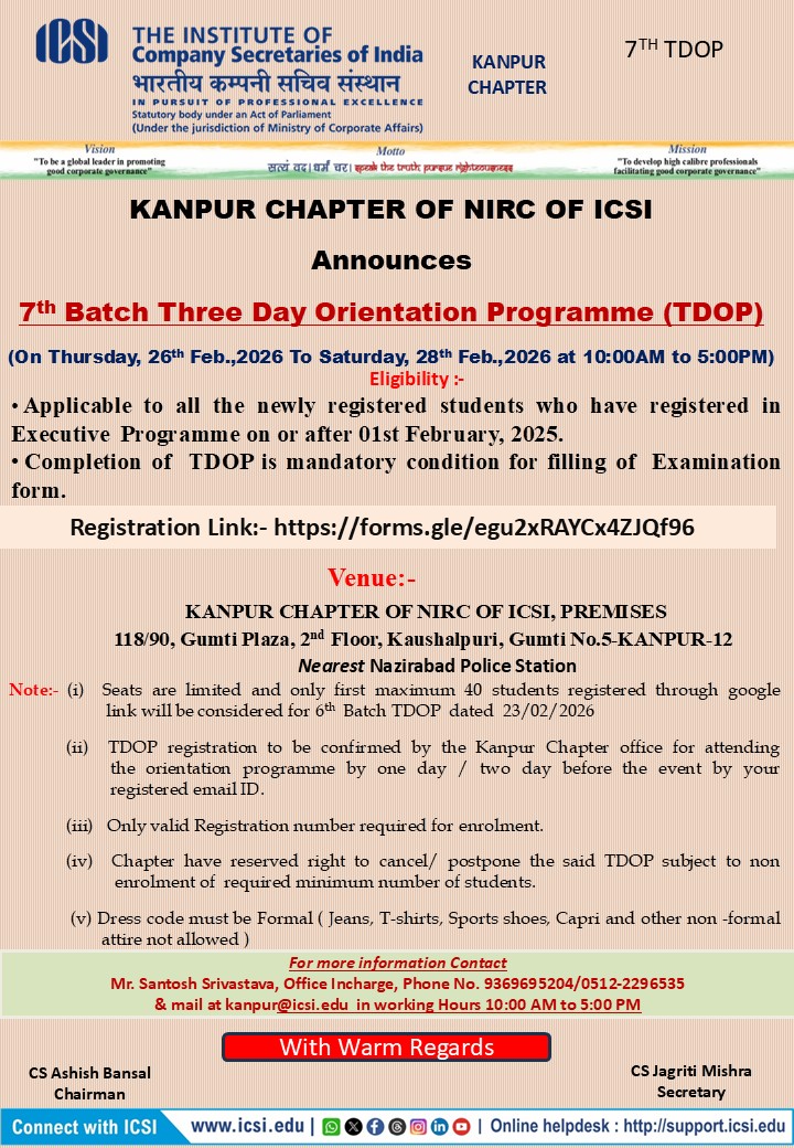 Mr. Santosh Srivastava, Office Incharge, Phone No. 9369695204/0512-2296535 & mail at kanpur@icsi.edu in working Hours 10:00 AM to 5:00 PM