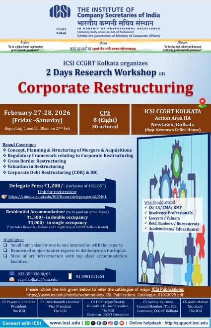 CCGRT Kolkata's 2 Days Research Workshop on Corporate Restructuring on 27th and 28th February 2026