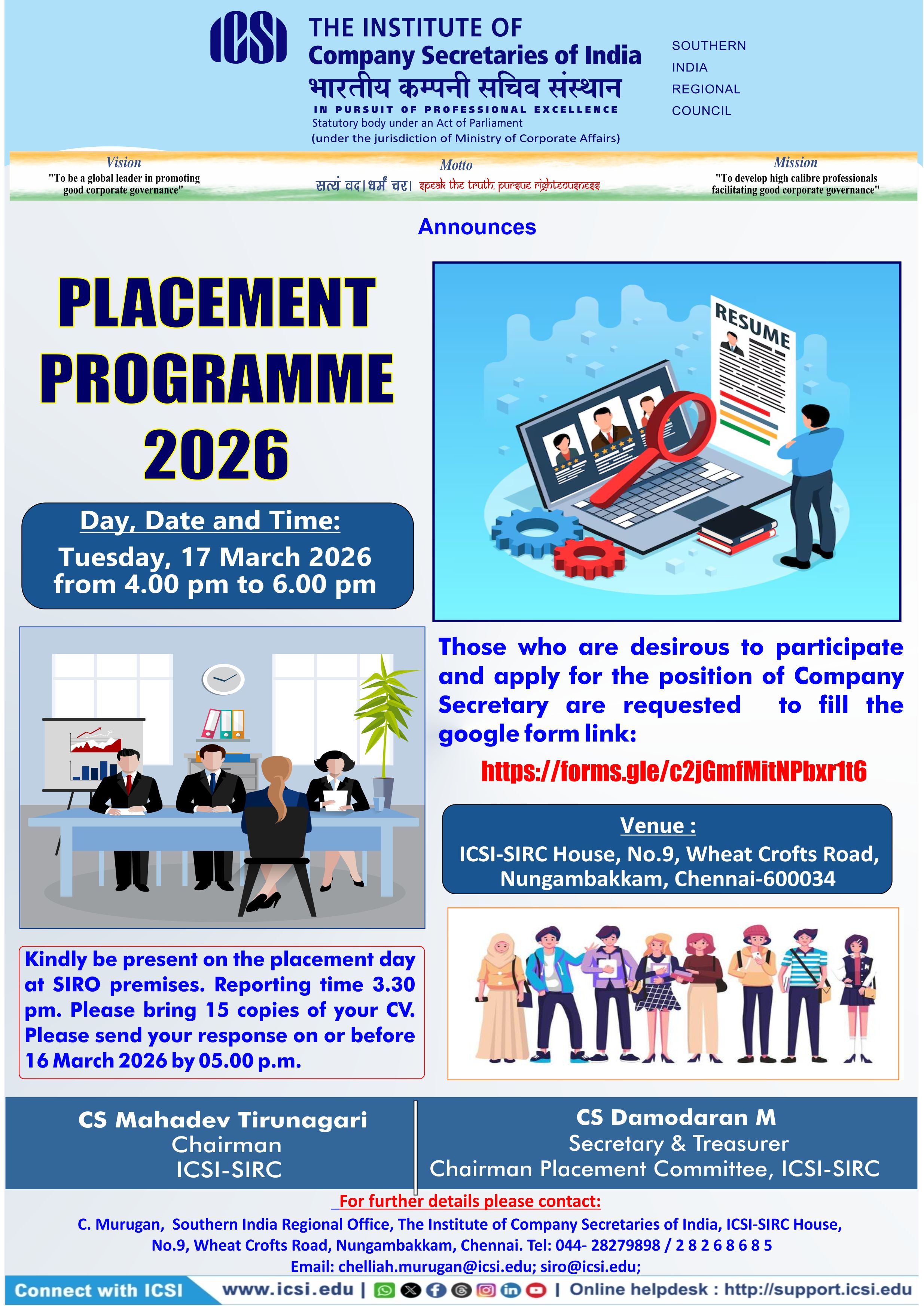 Placement Programme on Tuesday, 17 March 2026 at ICSI-SIRC House, Chennai (Member)