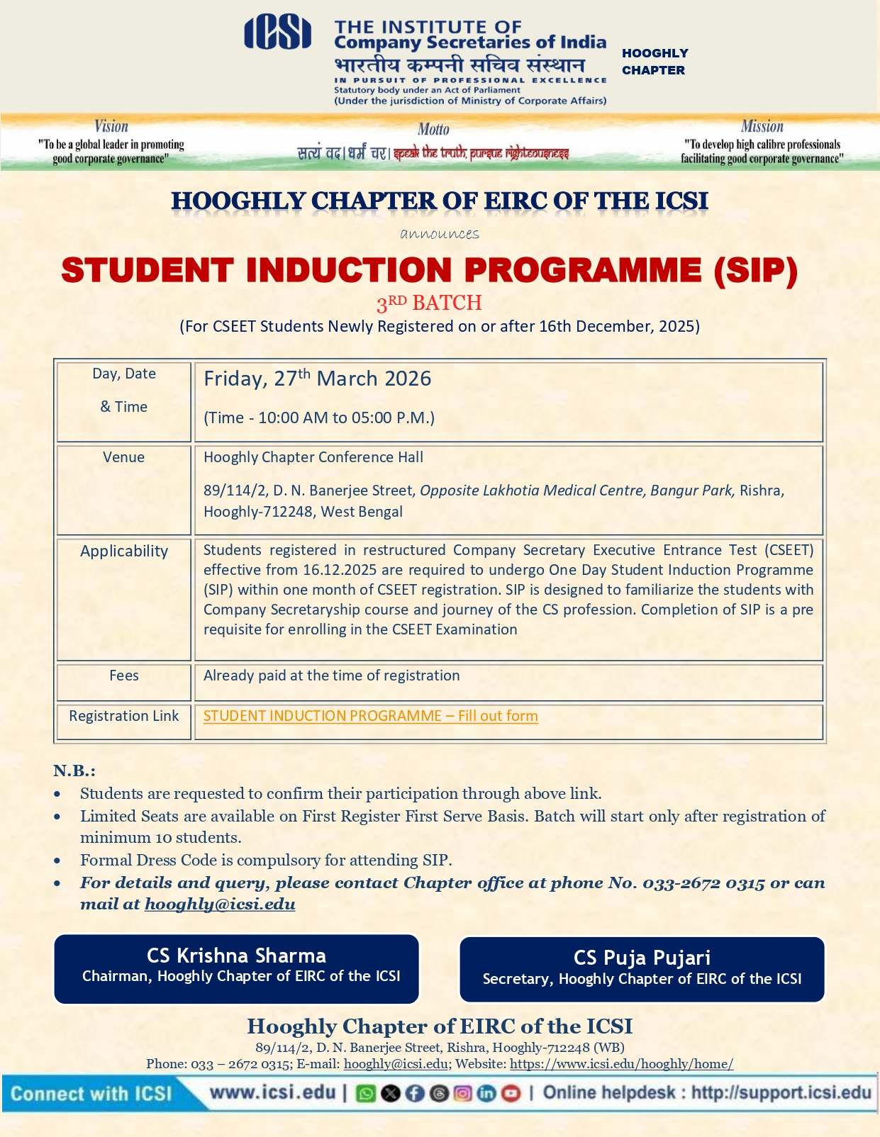 Students registered in restructured Company Secretary Executive Entrance Test (CSEET) effective from 16.12.2025 are required to undergo One Day Student Induction Programme (SIP) within one month of CSEET registration. SIP is designed to familiarize the students with Company Secretaryship course and journey of the CS profession. Completion of SIP is a pre requisite for enrolling in the CSEET Examination