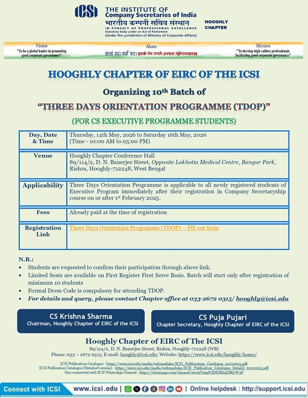 Hooghly Chapter of ICSI Krishna Kunj Apartment, 89/114/2, D. N. Banerjee Street, Rishra, Hooghly-712248 (WB)