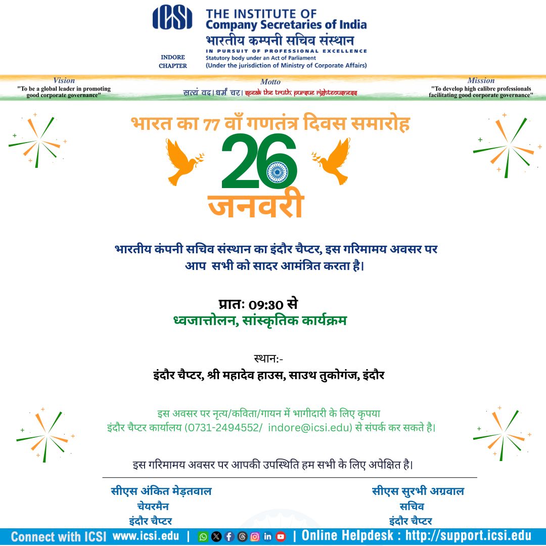 - On the auspicious occasion of the 77th Republic Day of India, the ICSI Indore Chapter is organizing a Republic Day Celebration to commemorate the spirit of our Constitution and the values of democracy, unity, and integrity.