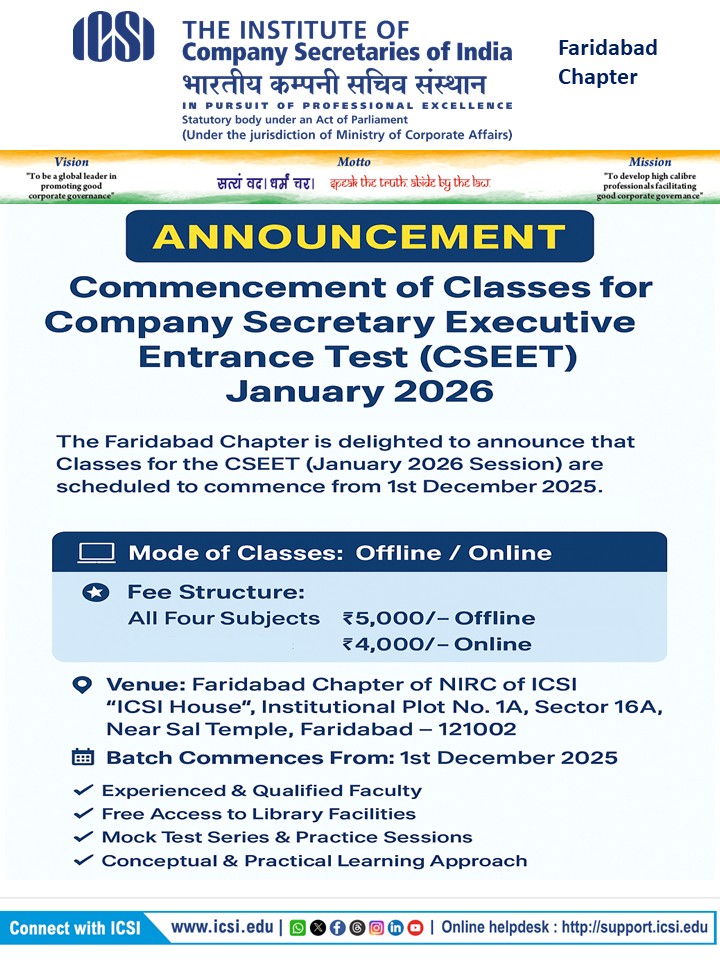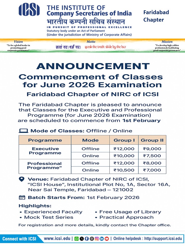 Faridabad Chapter of NIRC of ICSI announces Classroom its 16th Executive Development Program (EDP 16.0) From 19th January 2026 to 5th February 2026