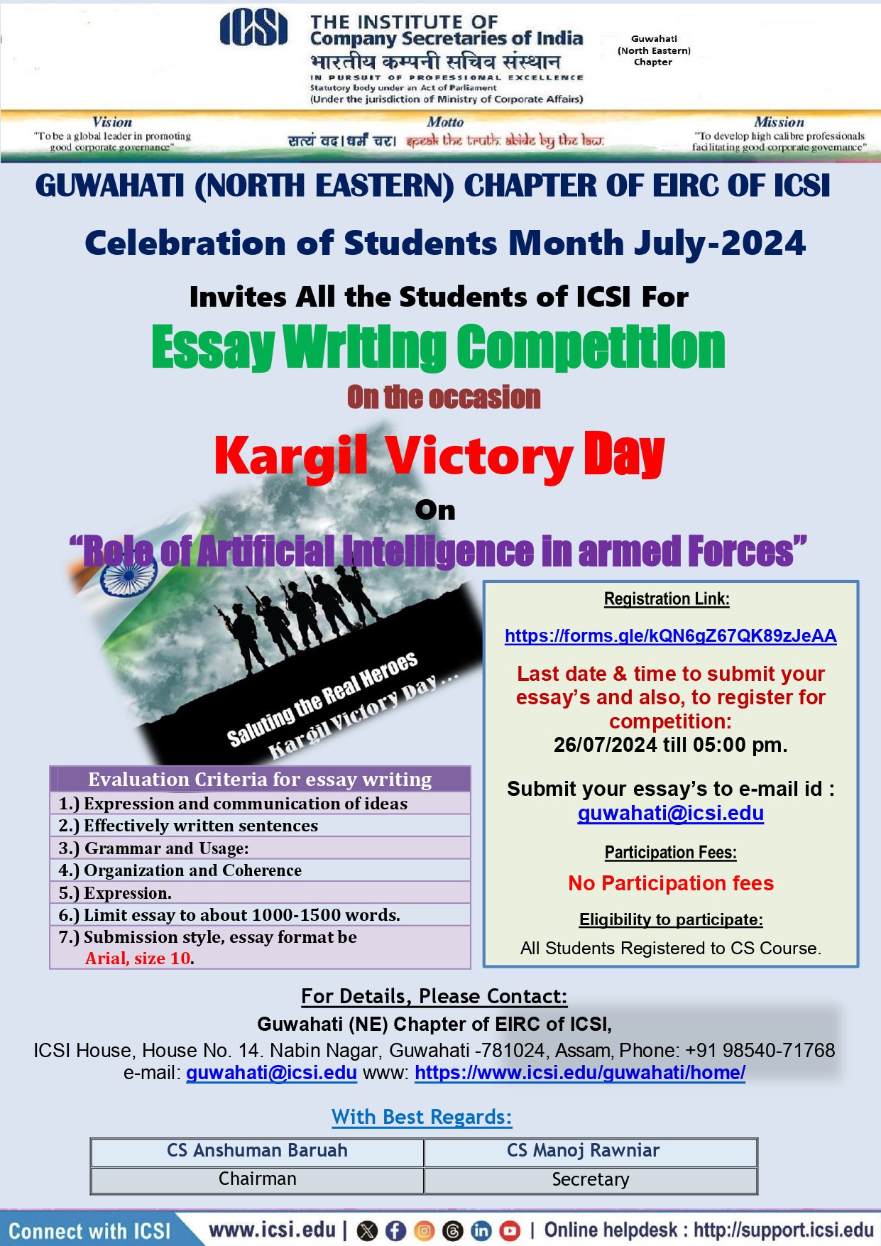 Essay Writing Competition on the ocassion of Kargil Victory Day; On the topic : "Role of Artificial Intelligence in armed Forces". Last date & time to submit the Essay's on e-mail id - guwahati@icsi.edu & to register is 26th July, 2024 till 05:00 pm.