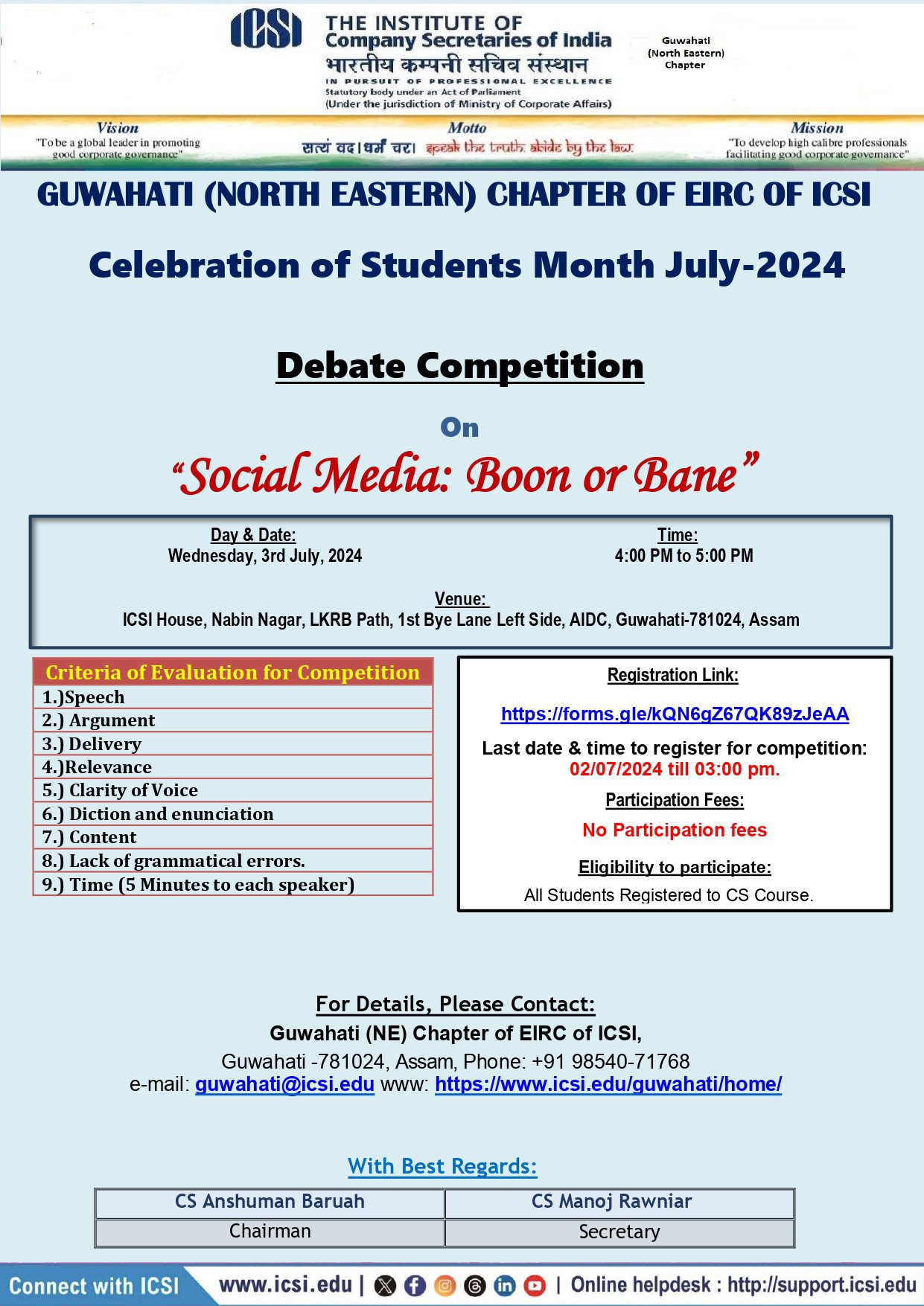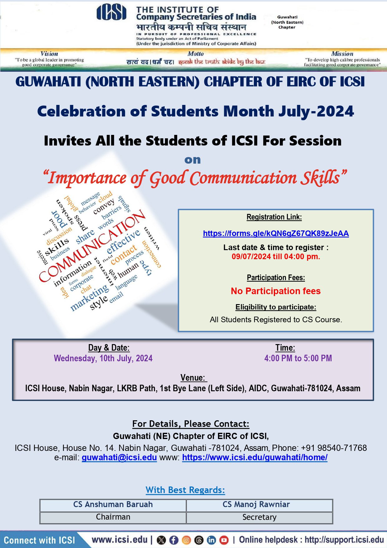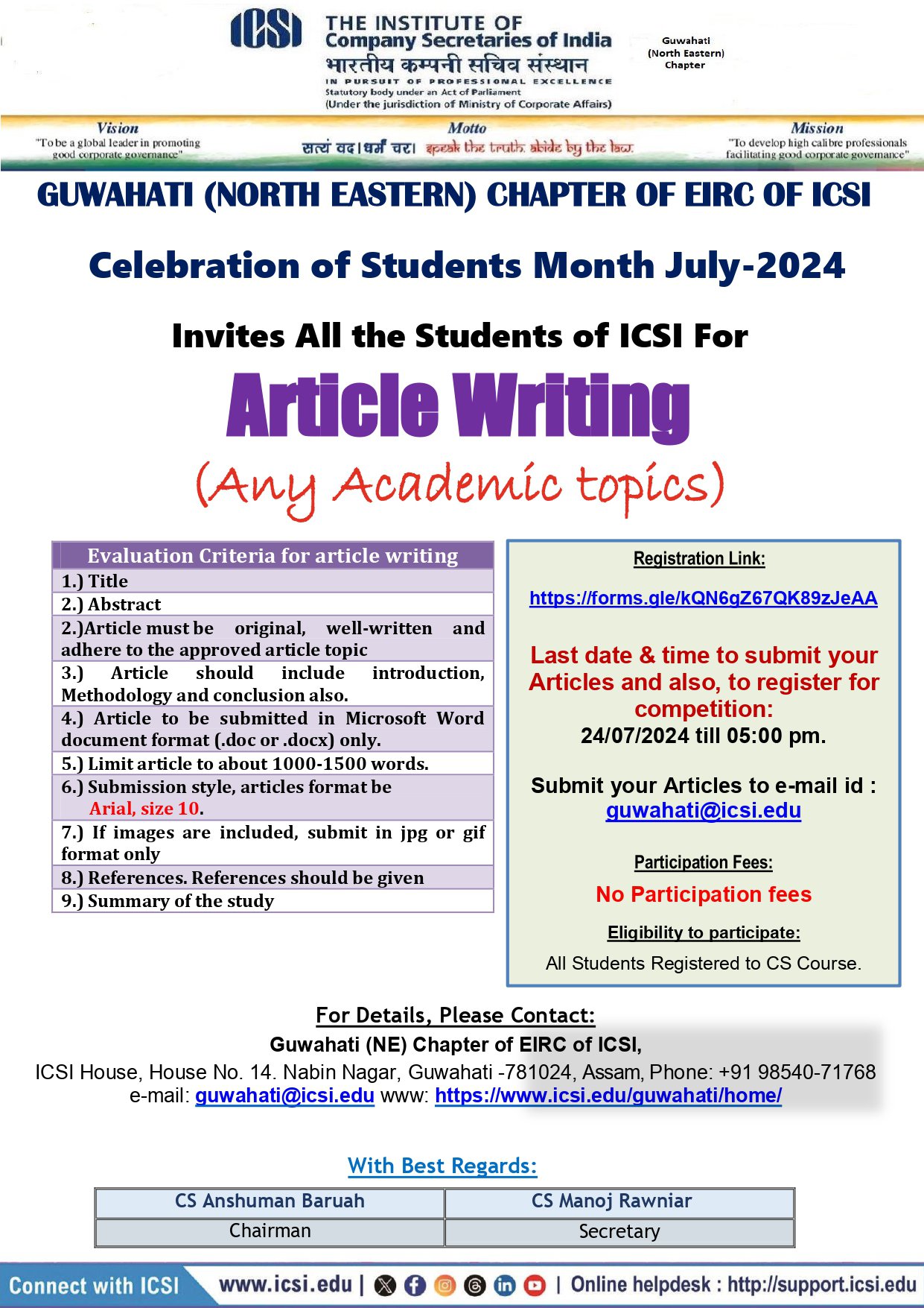 Articles are invited from CS Students on academic topic to be submitted on or before 24th July, 2024 upto 05:00 pm on e-mail id at guwahati@icsi.edu in word format.