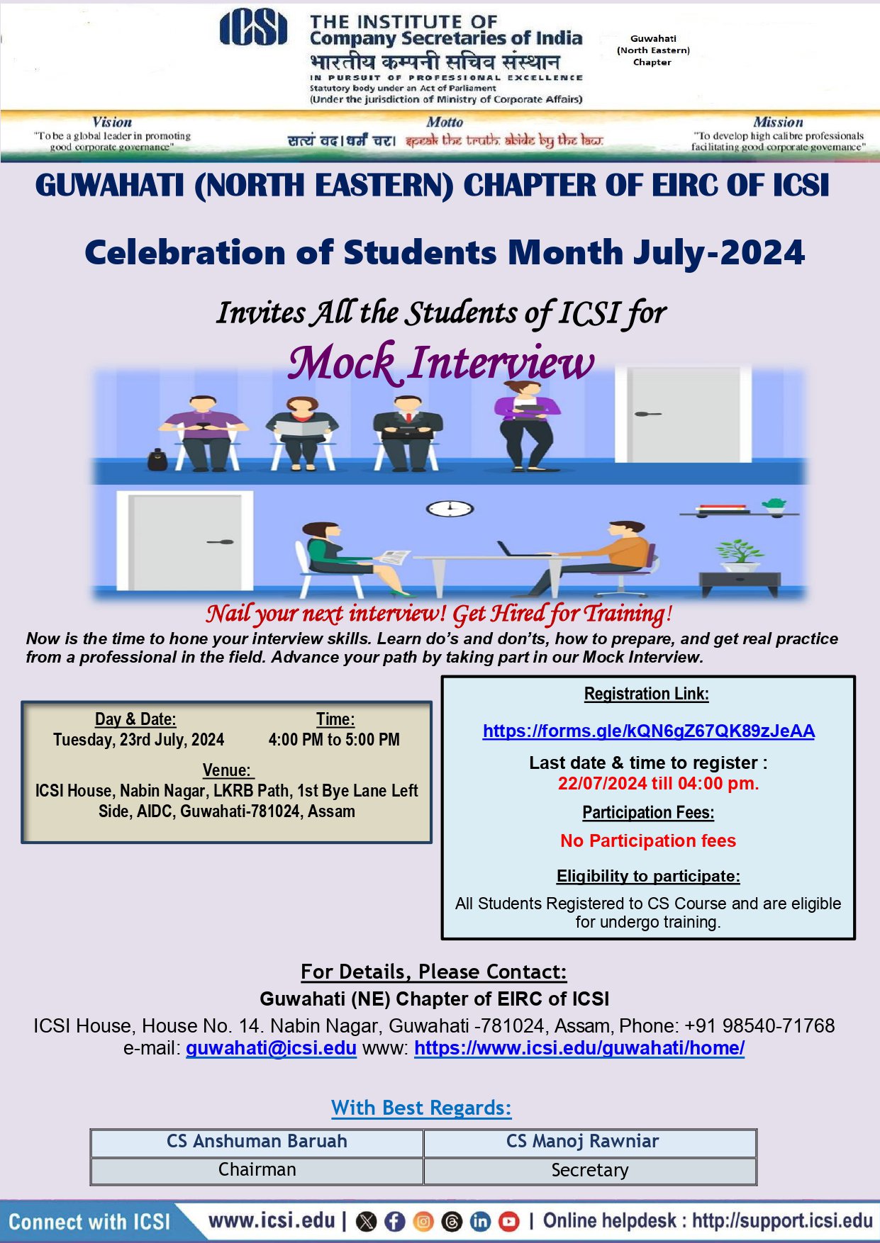 Mock Interview scheduled for CS Students who are eligible for training scheduled to be held on 23rd July, 2024 at 04:00 pm.