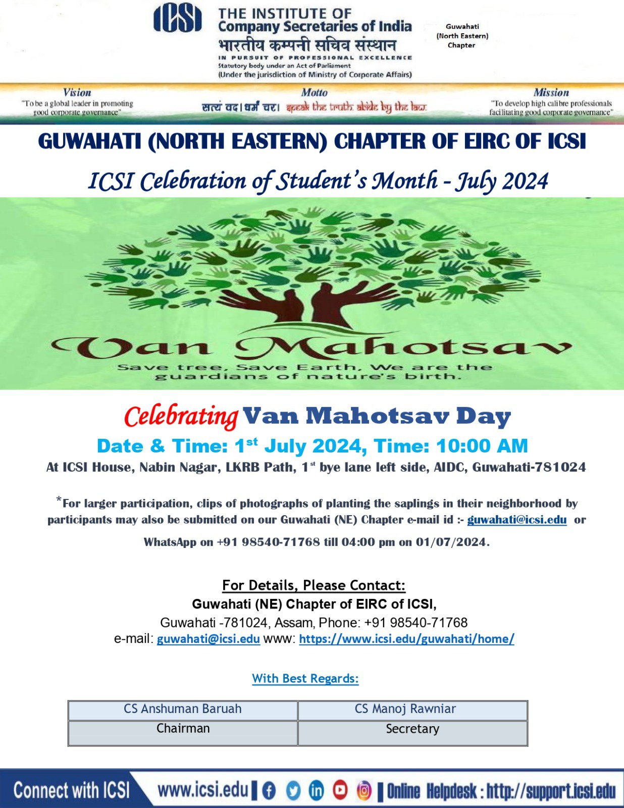Slogan Writing Competition on the THEME : "World Nature Conservation Day". Last date & time to submit the Slogan's on e-mail id - guwahati@icsi.edu & to register is 28th July, 2024 till 05:00 pm.