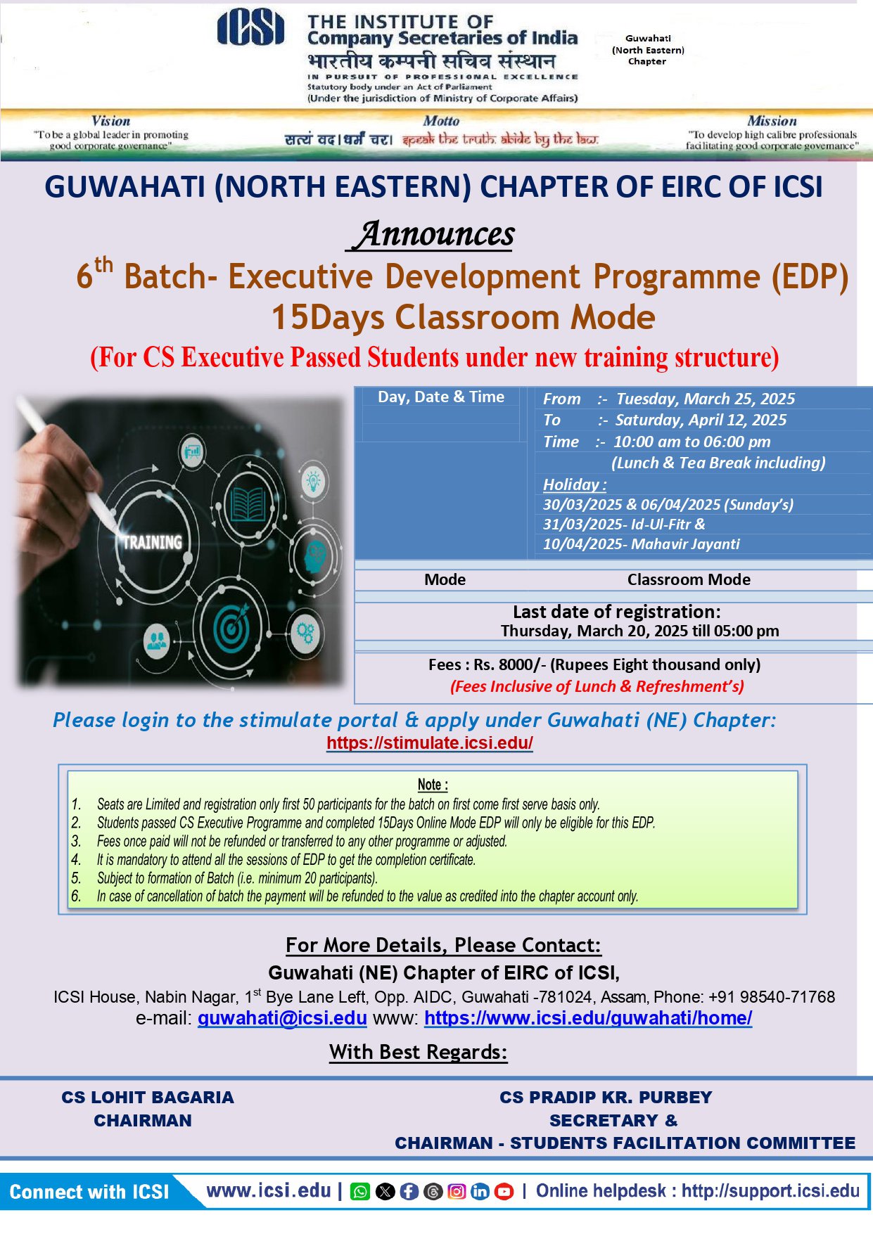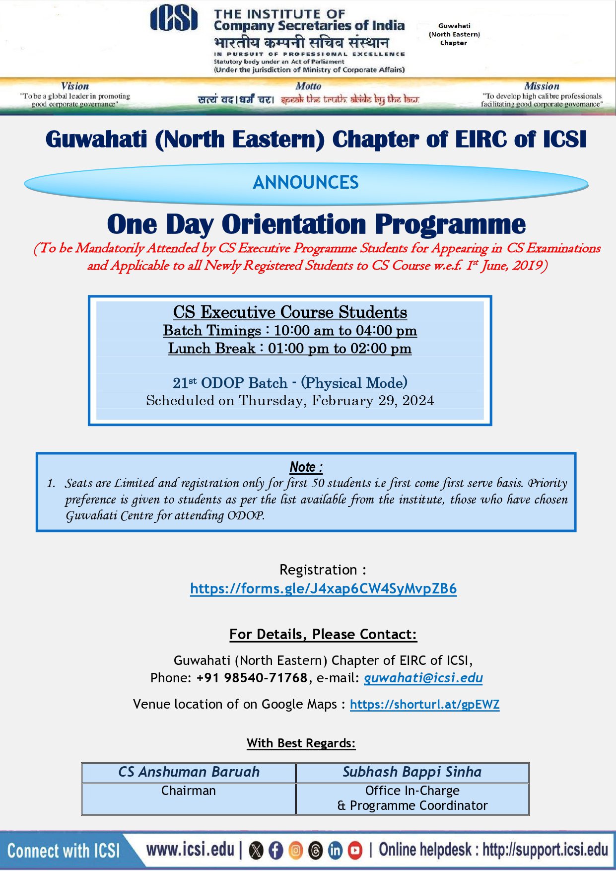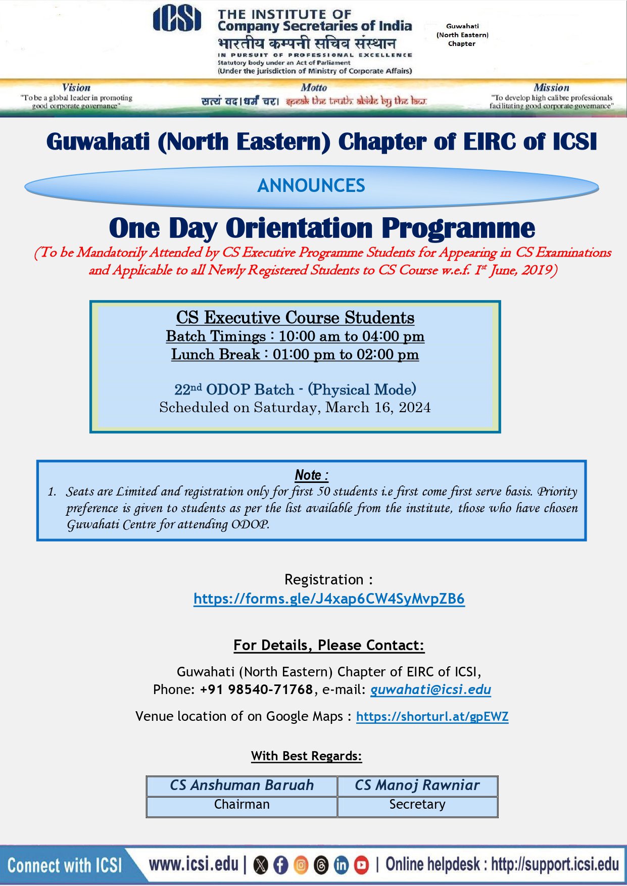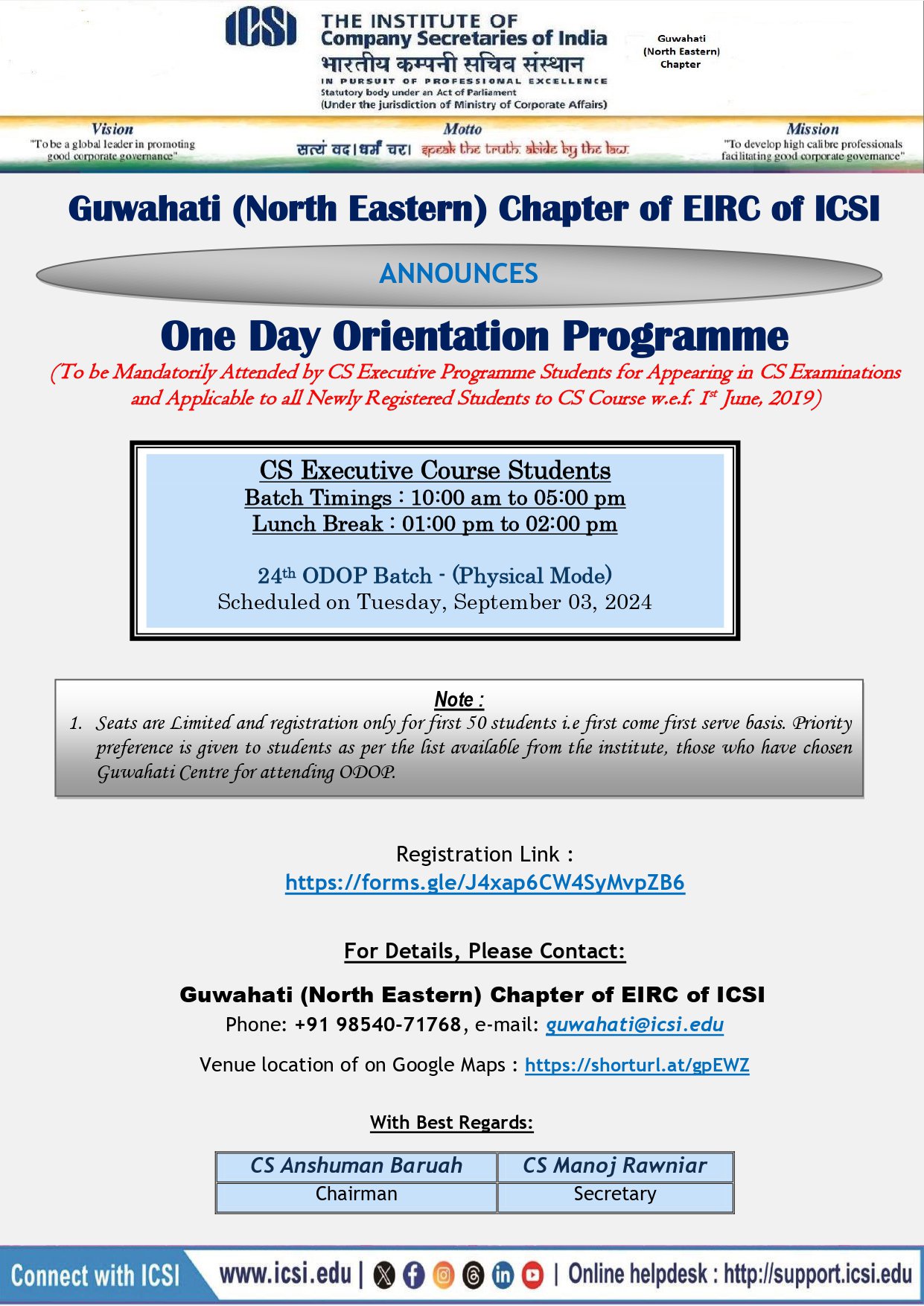 25th Batch - One Day Orientation Programme (ODOP) - (Physical Mode) scheduled to be held on 28/01/2025 at 10:00 am at Guwahati (NE) Chapter of EIRC of ICSI