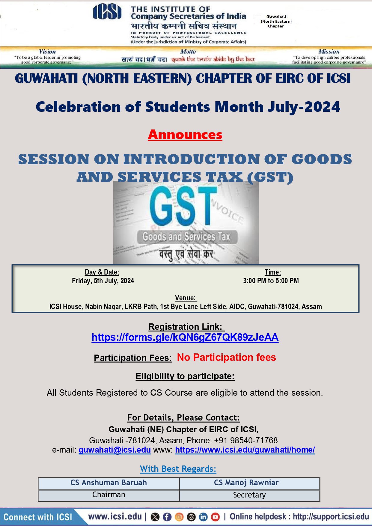 Session on the topic : "Introduction of Goods and Services Tax (GST) to be held on 5th July, 2024 at 03:00 pm to 05:00 pm.