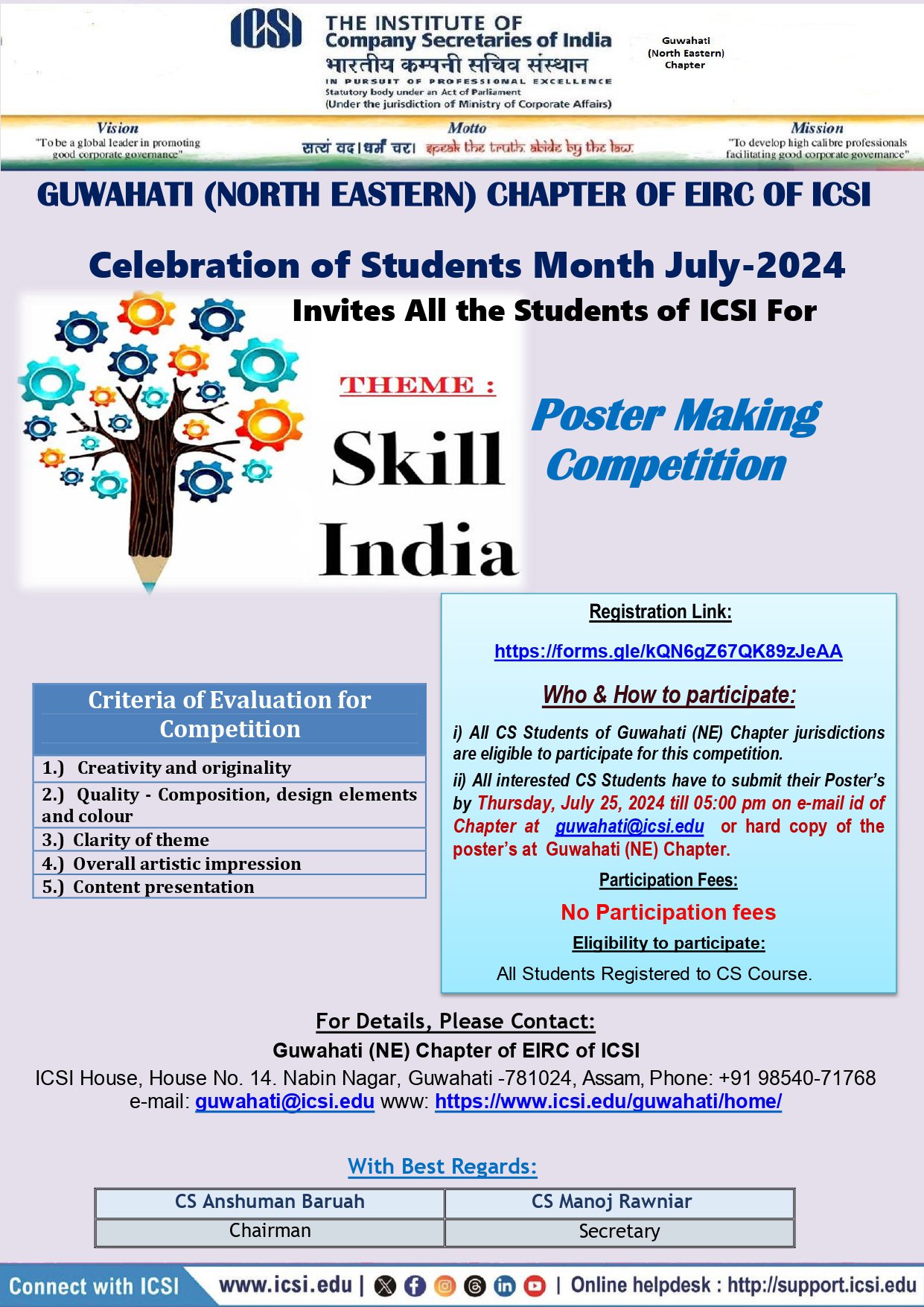 Poster Making Competition on the topic : "Skill India". Last date & time to submit the Poster's on e-mail id - guwahati@icsi.edu & to register is 25th July, 2024 till 05:00 pm.