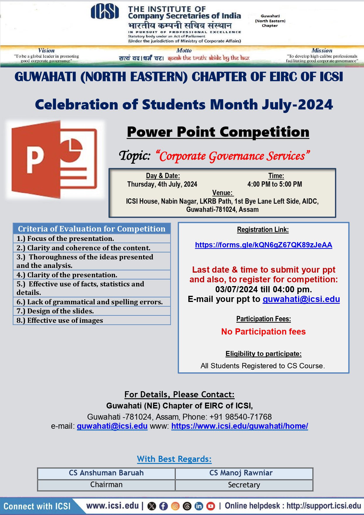 Power Point Competition on the topic :- "Corporate Governance Services" to be held on 4th July, 2024 at 04:00 pm.
