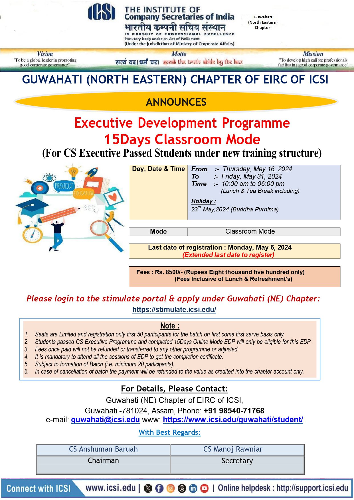4th Batch - Executive Development Programme (EDP) Classroom Mode scheduled to be held from 16/05/2024 to 31/05/2024 (Revised dates).