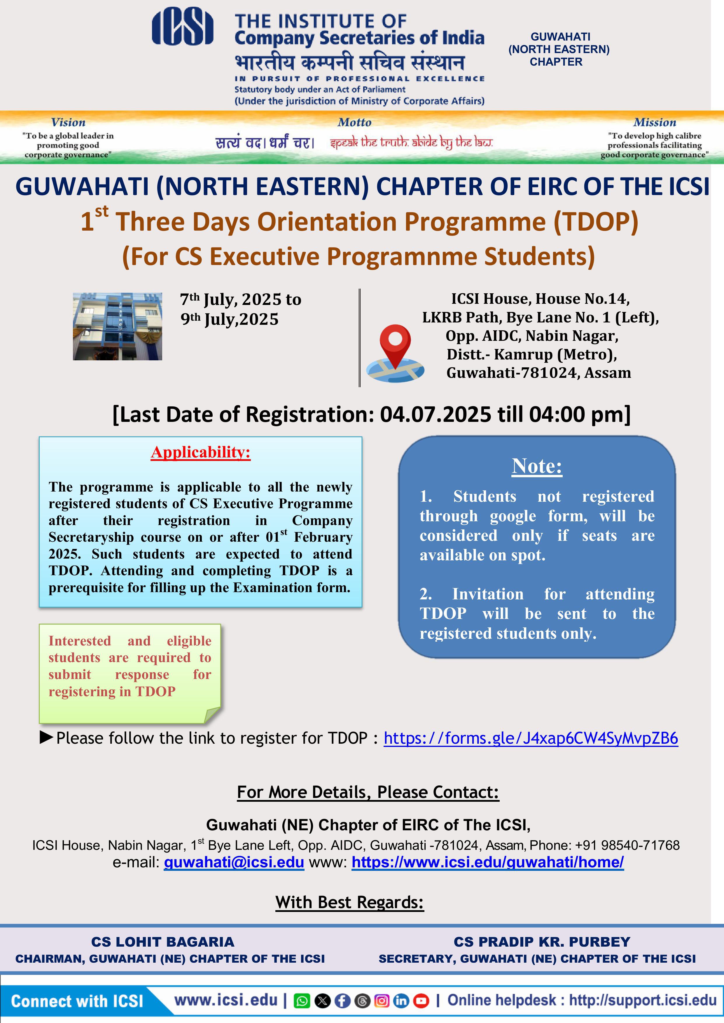 1st Three Days Orientation Programme (TDOP) in physical Mode for Newly registered CS Executive Students to be held at Guwahati (NE) Chapter from 7th - 9th July,2025