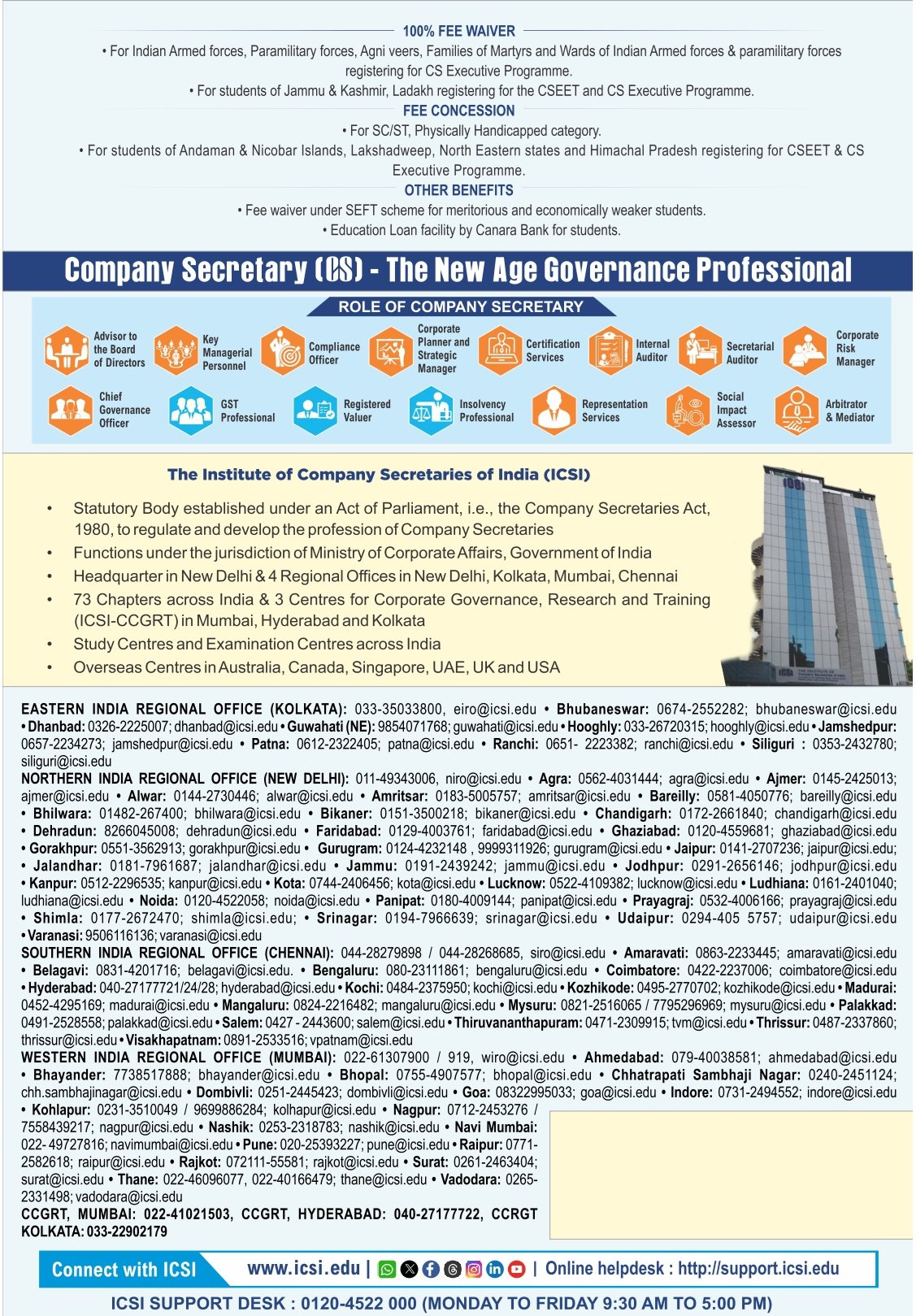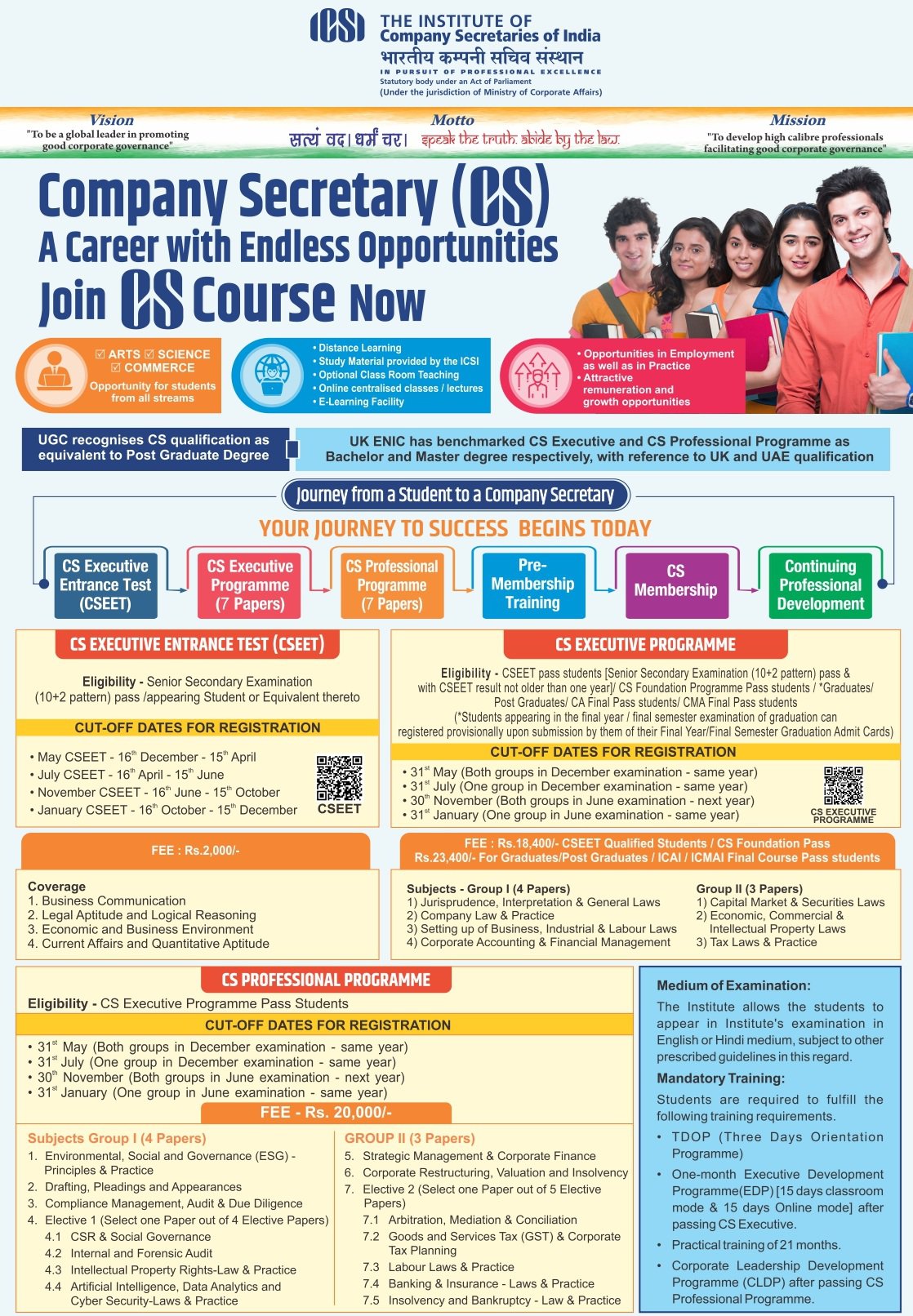 The Institute of Company Secretaries of India(ICSI) is constituted under an Act of Parliament i.e. the Company Secretaries Act, 1980 (Act No. 56 of 1980). ICSI is the only recognized professional body in India to develop and regulate the profession of Company Secretaries in India. The Institute of Company Secretaries of India awards the certificate of bestowing the designation of Company Secretary(CS) to a candidate qualifying for the membership of the Institute. It was in 1960 that the Company Law Board started a course in Company Secretaryship leading to the award of Government Diploma in Company Secretaryship. As the number of students taking up the Company Secretaryship course grew, the Government promoted on 4th October, 1968, Institute of Company Secretaries of India under Section 25 of the Companies Act, 1956 for taking over from the Government the conduct of Company Secretaryship examination. The Institute of Company Secretaries of India (ICSI) has since been converted into a statutory body w.e.f. 1.1.1981 under the Company Secretaries Act, 1980. The Institute of company Secretaries of India (ICSI) has its headquarters at New Delhi and four regional offices at New Delhi, Chennai, Kolkata and Mumbai. The Institute has four Regional Councils and under their jurisdiction 70 Chapters.