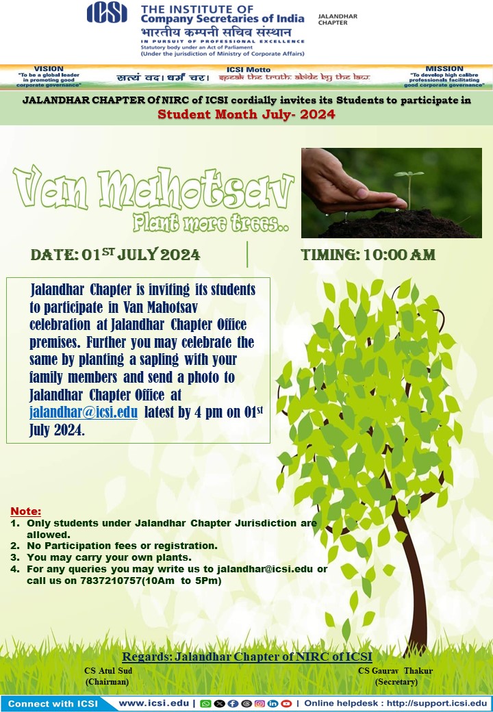 # ICSI Jalandhar Chapter announces Van Mahotsav under Student Month 2024 on 1st July2024 by 10:00Am