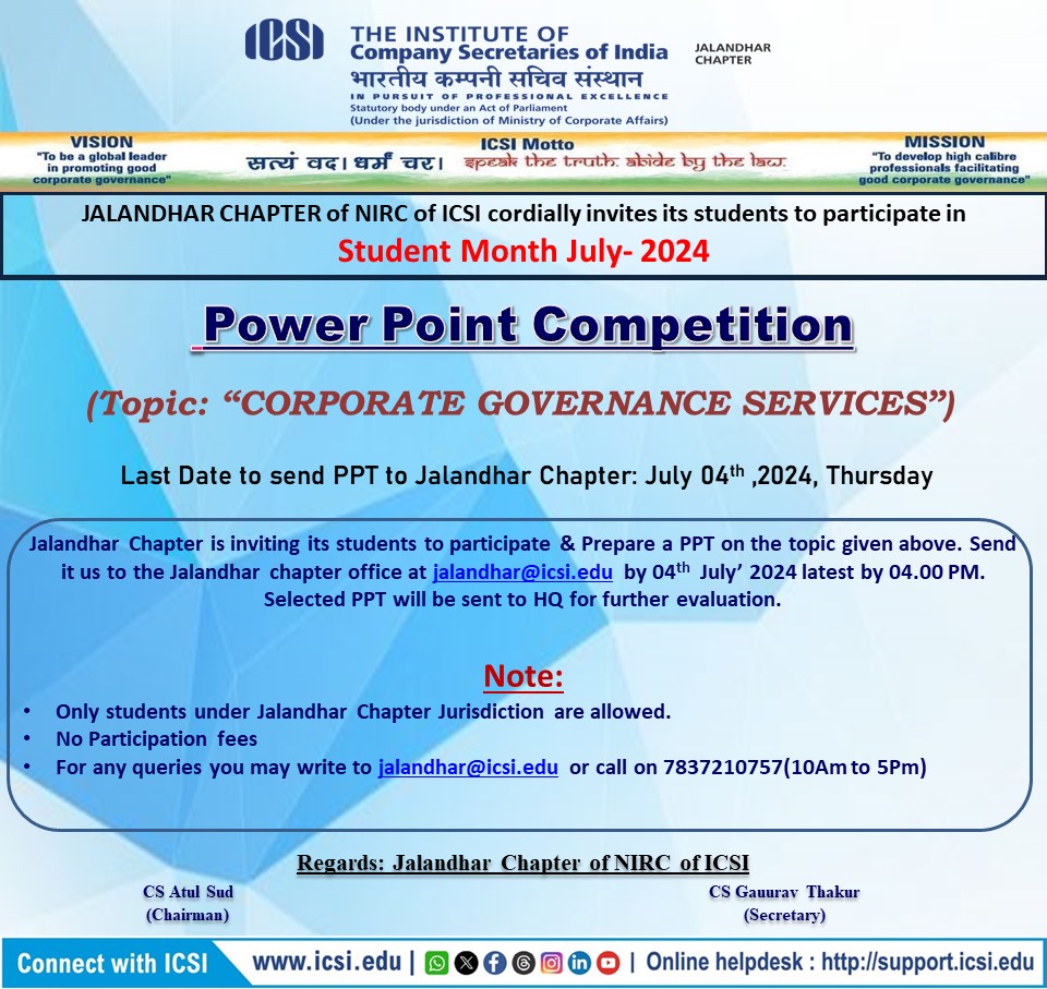 # ICSI Jalandhar Chapter announces Power Point Competition under Student Month 2024 on 04th July2024
