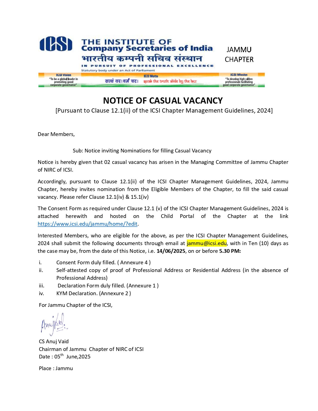 JAMMU CHAPTER OF NIRC OF ICSI IS ORGANISING ONE DAY ORIENTATION PROGRAM (ODOP) ON FRIDAY, 21ST JUNE 2024