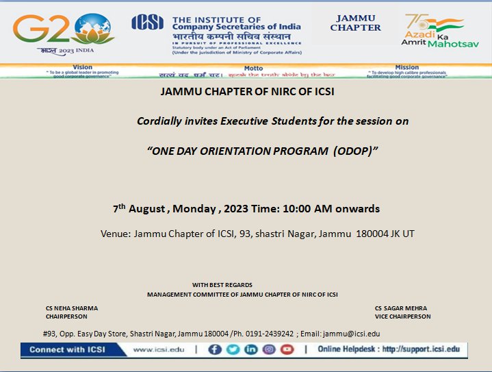 JAMMU CHAPTER OF NIRC OF ICSI IS ORGANISING ONE DAY ORIENTATION PROGRAM (ODOP) ON MONDAY, 7TH AUGUST 2023 @ 10 AM ONWARDS...