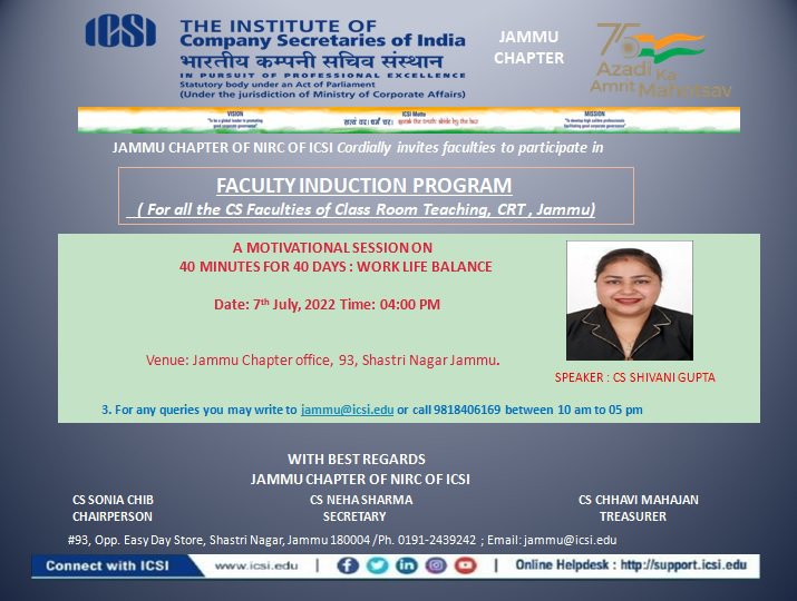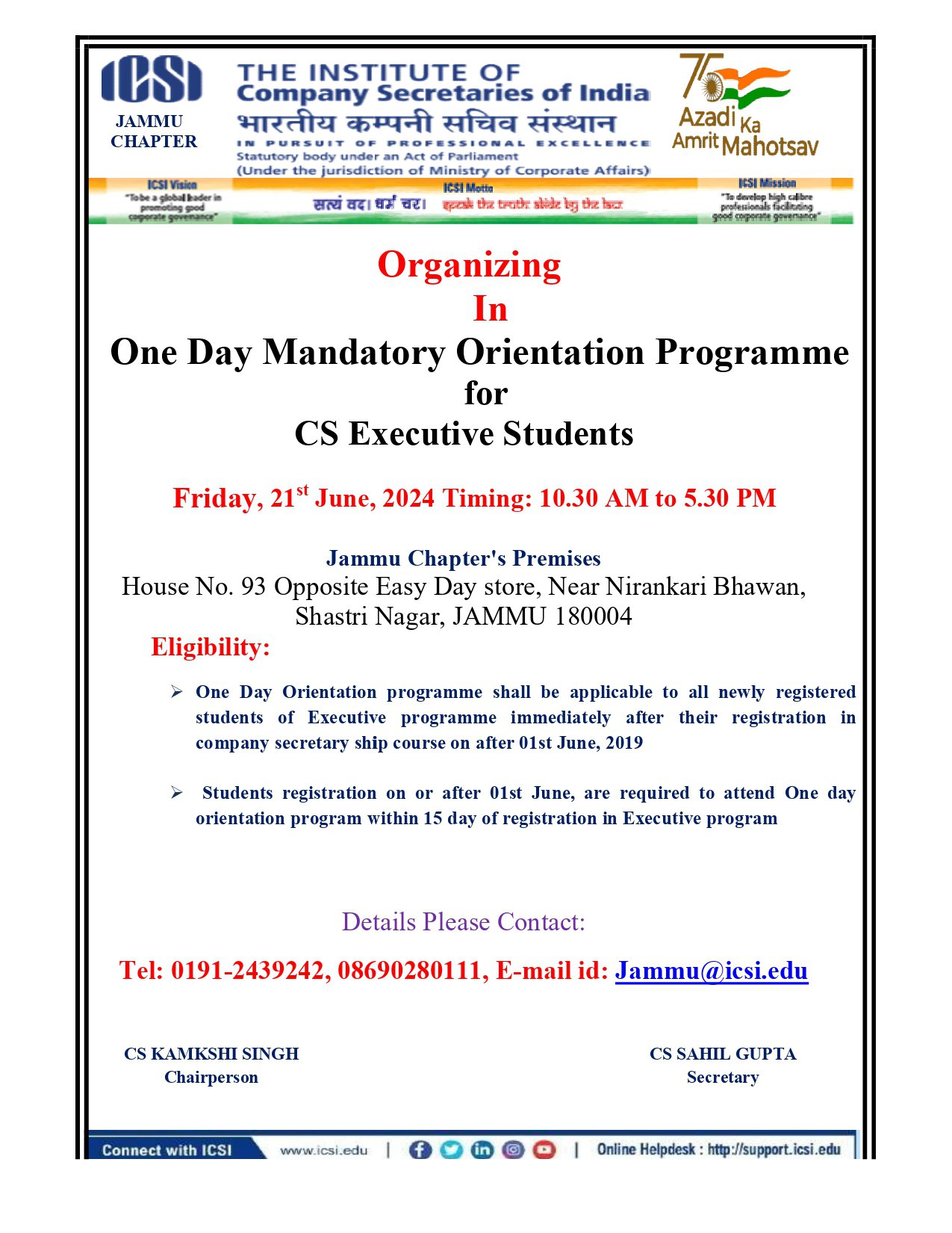 JAMMU CHAPTER OF NIRC OF ICSI IS ORGANISING ONE DAY ORIENTATION PROGRAM (ODOP) ON FRIDAY, 21ST JUNE 2024