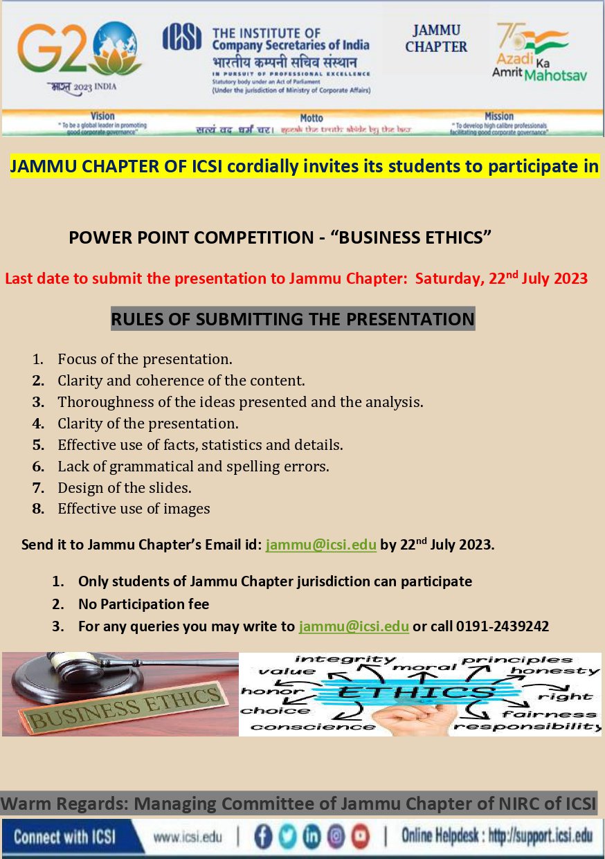 7. Power Point Presentation Competition : Business Ethics on 23rd July 2023 at 03:00 PM