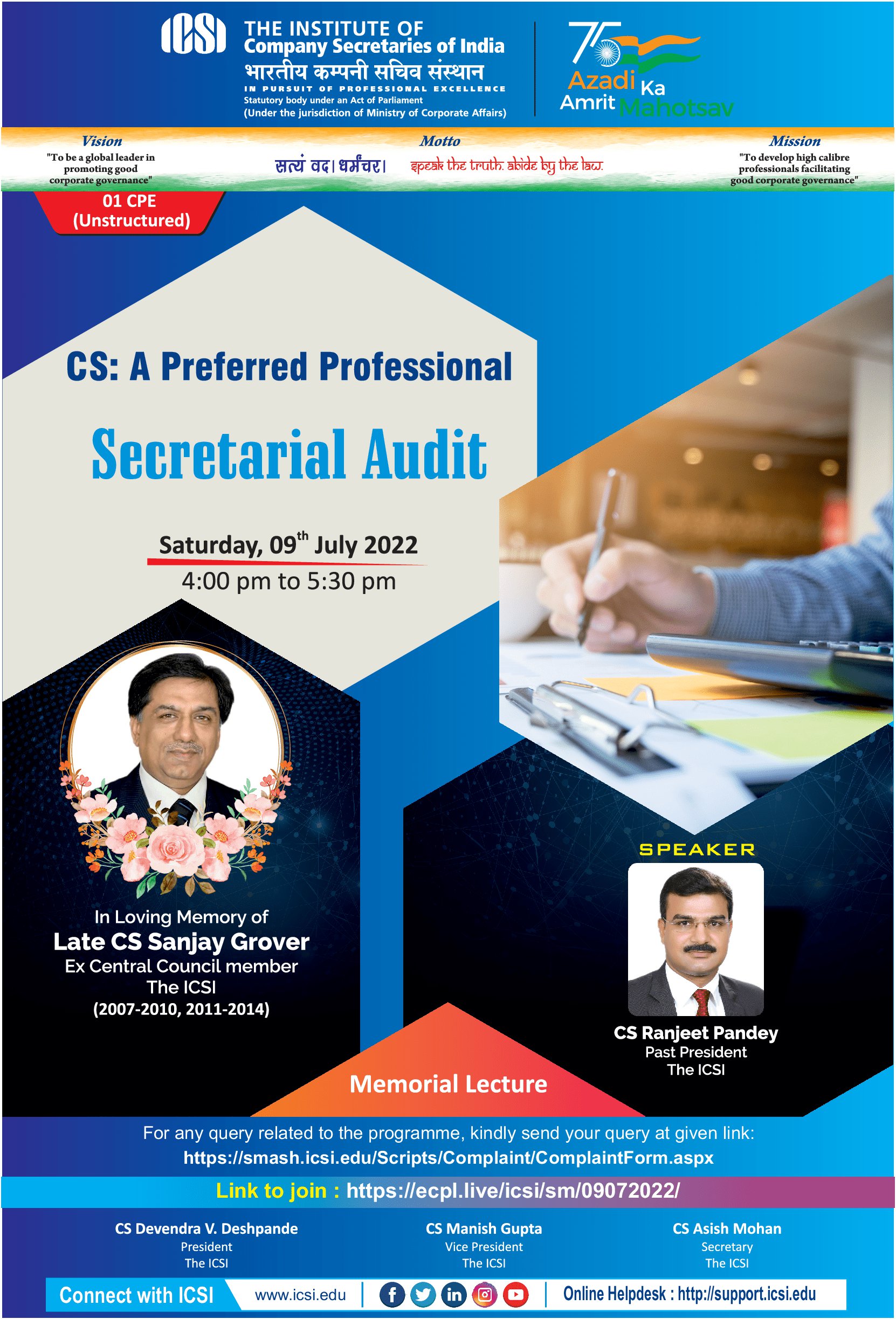 7. MEMORIAL LECTURE FOR STUDENTS BY ICSI HQ ON THE TOPIC SECRETARIAL AUDIT 9TH JULY 2022