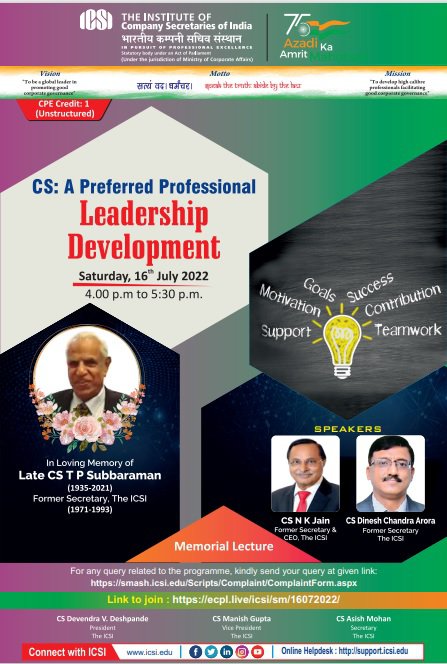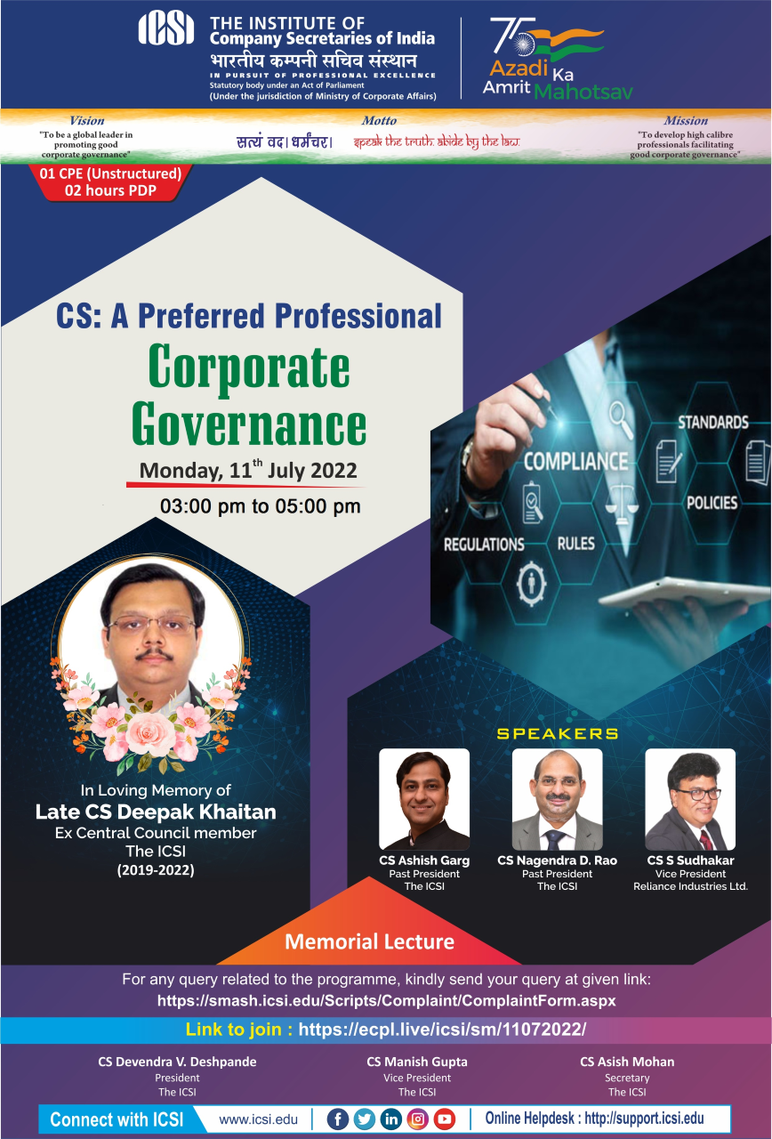 8. MEMORIAL LECTURE FOR STUDENTS BY ICSI HQ ON THE TOPIC CORPORATE GOVERNANCE 11TH JULY 2022