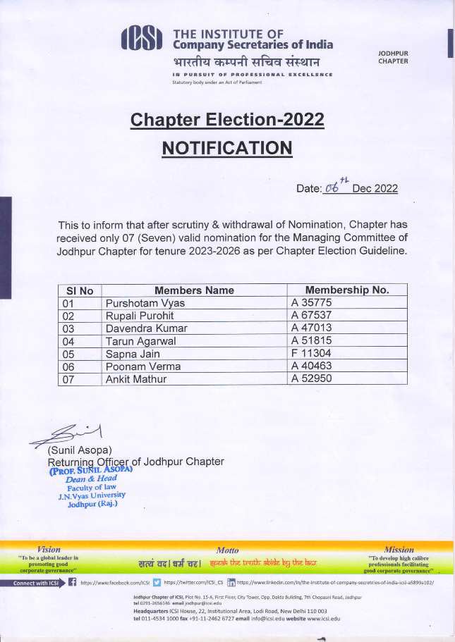ICSI Signature Award Signed with JNVU, on 16th April 2018