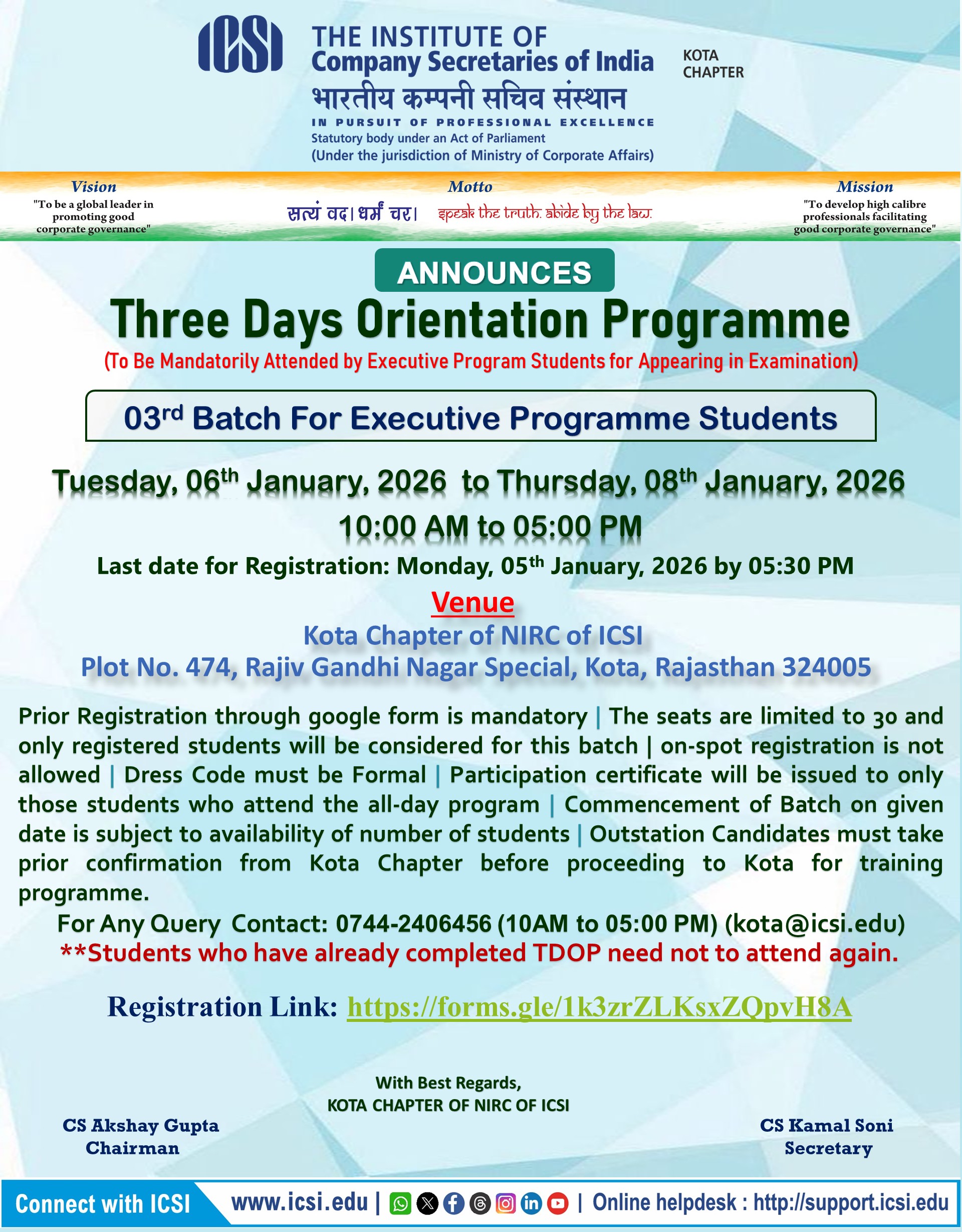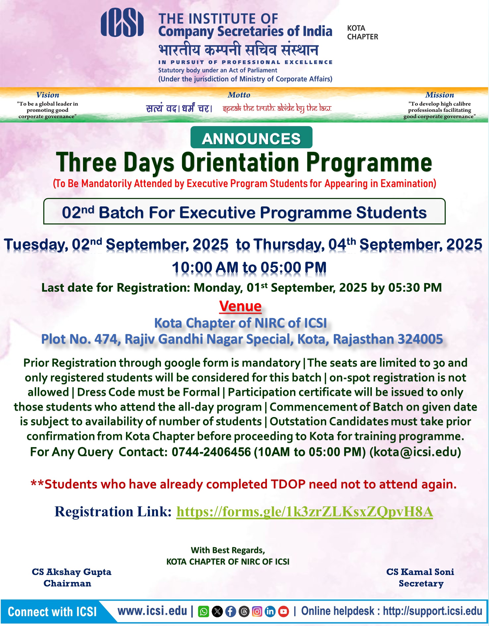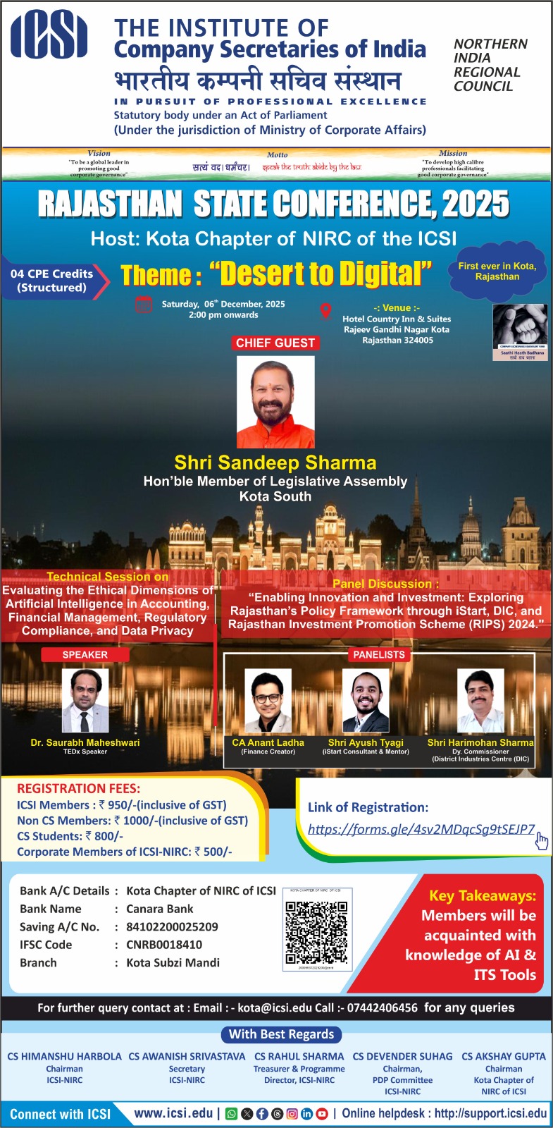 # ICSI Kota Chapter inviting for the position in various Sub-Committees from its Members having professional address of Kota may nominate themselves through the given link. Click Here to fill the google form of Kota Chapter Sub-Committee