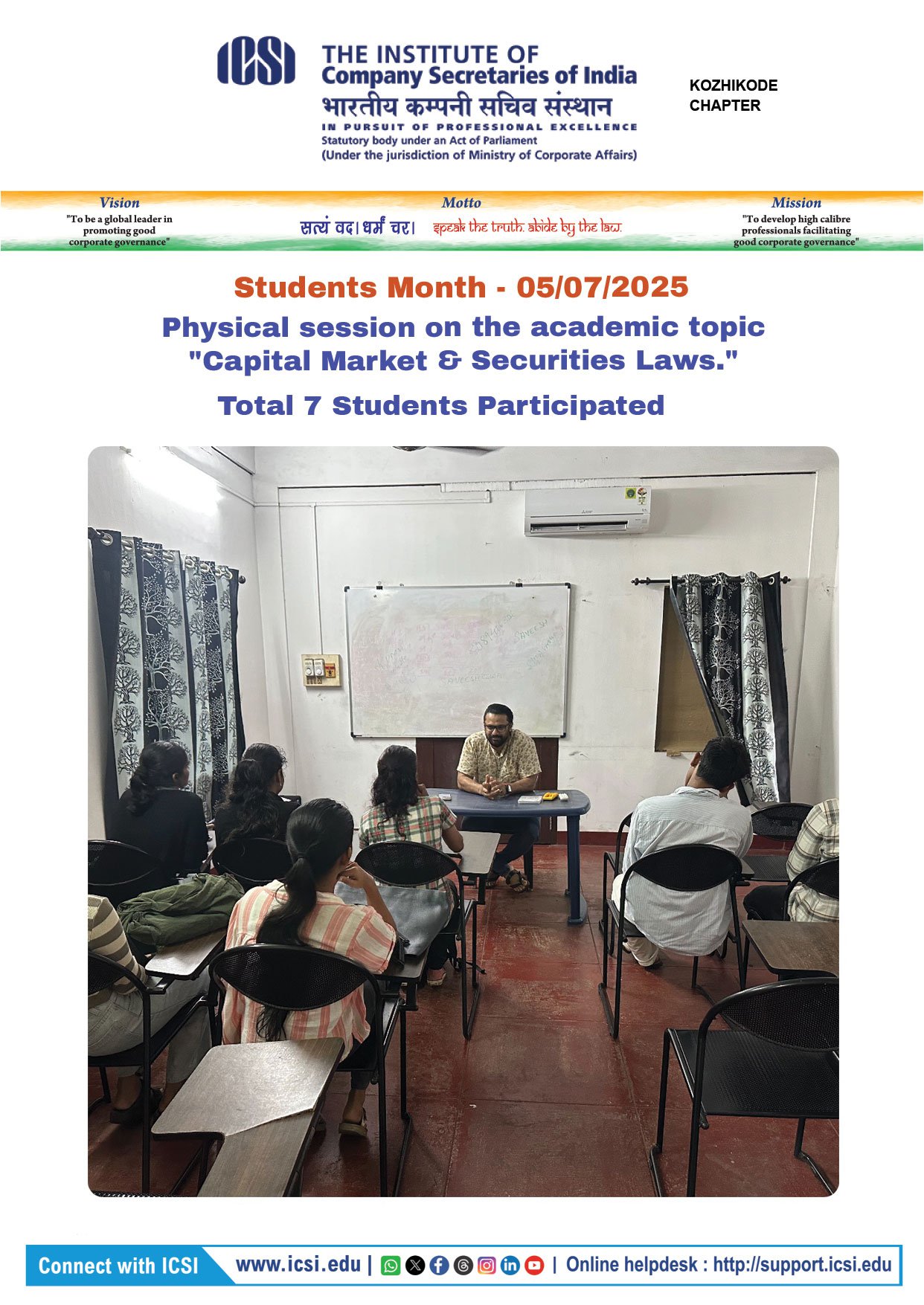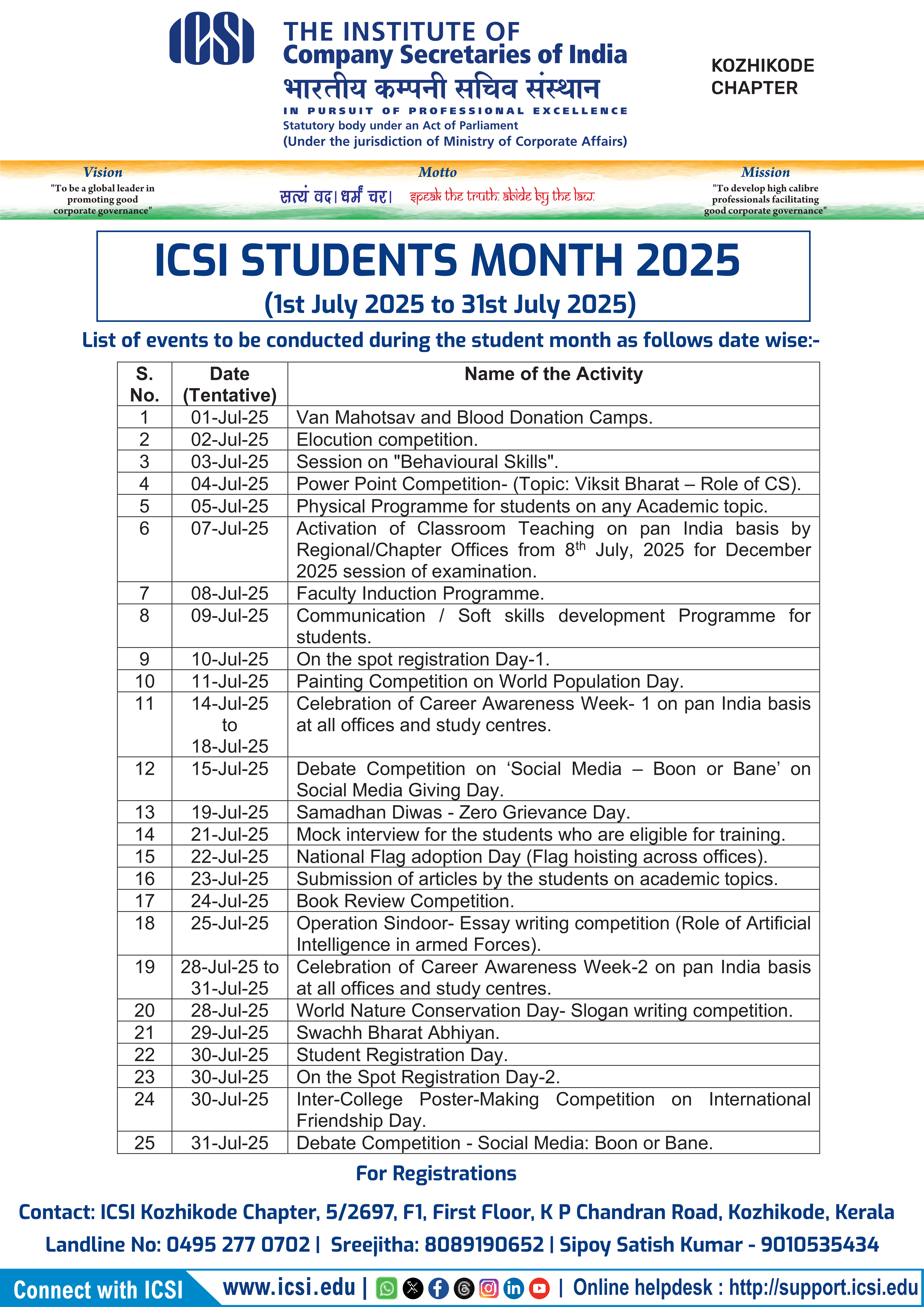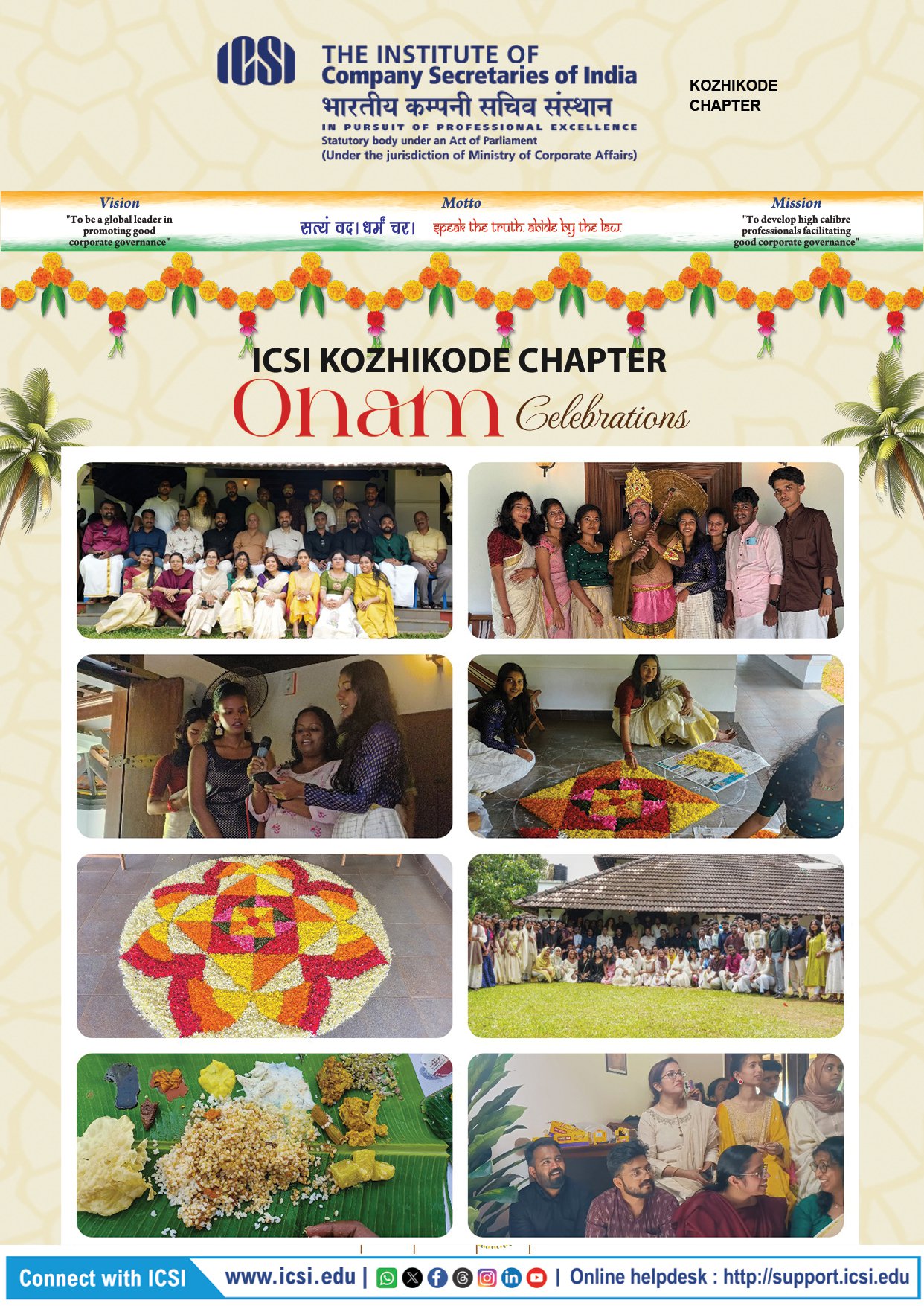 The ICSI Kozhikode Chapter joyfully celebrated the vibrant festival of Onam with great enthusiasm and traditional spirit. Students and members came together to interact, bond, and share festive moments of joy. The celebrations included the beautiful Pookkalam (floral decoration), a grand Onam Sadhya (traditional feast), and lively cultural exchanges, creating an atmosphere of unity and togetherness.