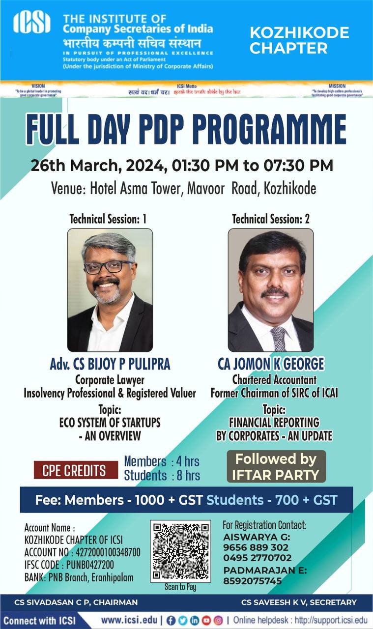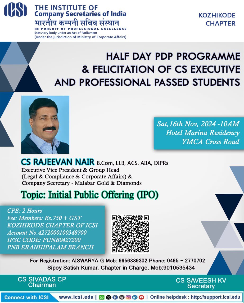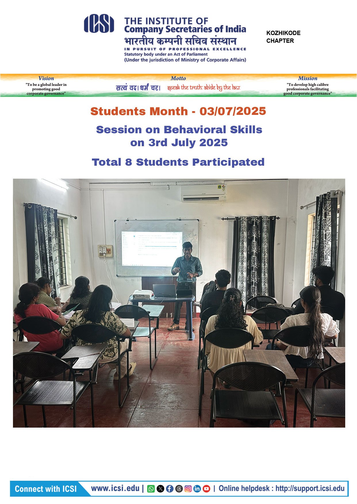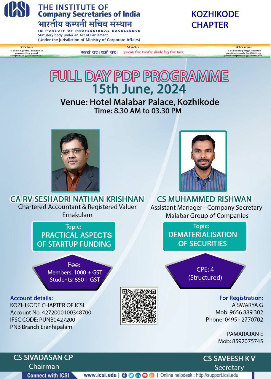 The ICSI Kozhikode Chapter joyfully celebrated the vibrant festival of Onam with great enthusiasm and traditional spirit. Students and members came together to interact, bond, and share festive moments of joy. The celebrations included the beautiful Pookkalam (floral decoration), a grand Onam Sadhya (traditional feast), and lively cultural exchanges, creating an atmosphere of unity and togetherness.