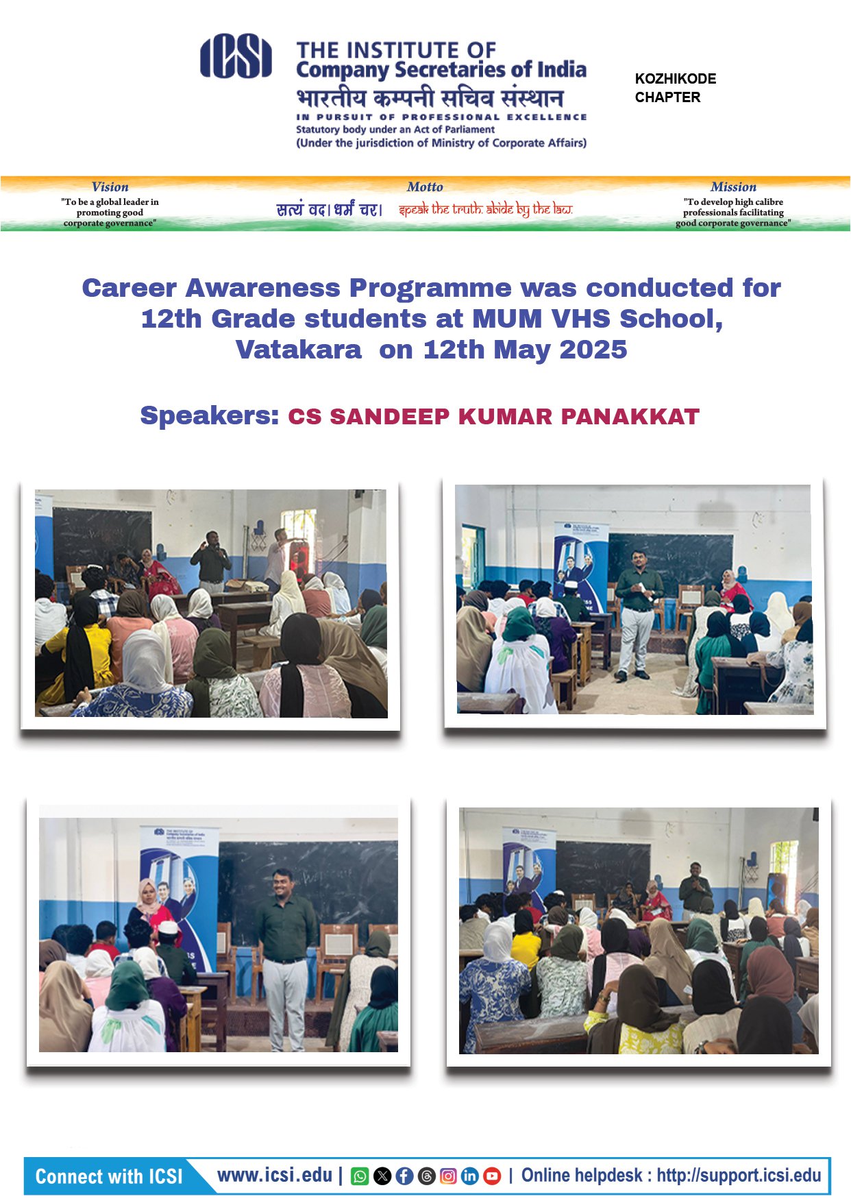 We sincerely thank MUM VHSS, Kozhikode, for their support and for providing us the platform to engage with students and share valuable information about a career in Company Secretaryship.