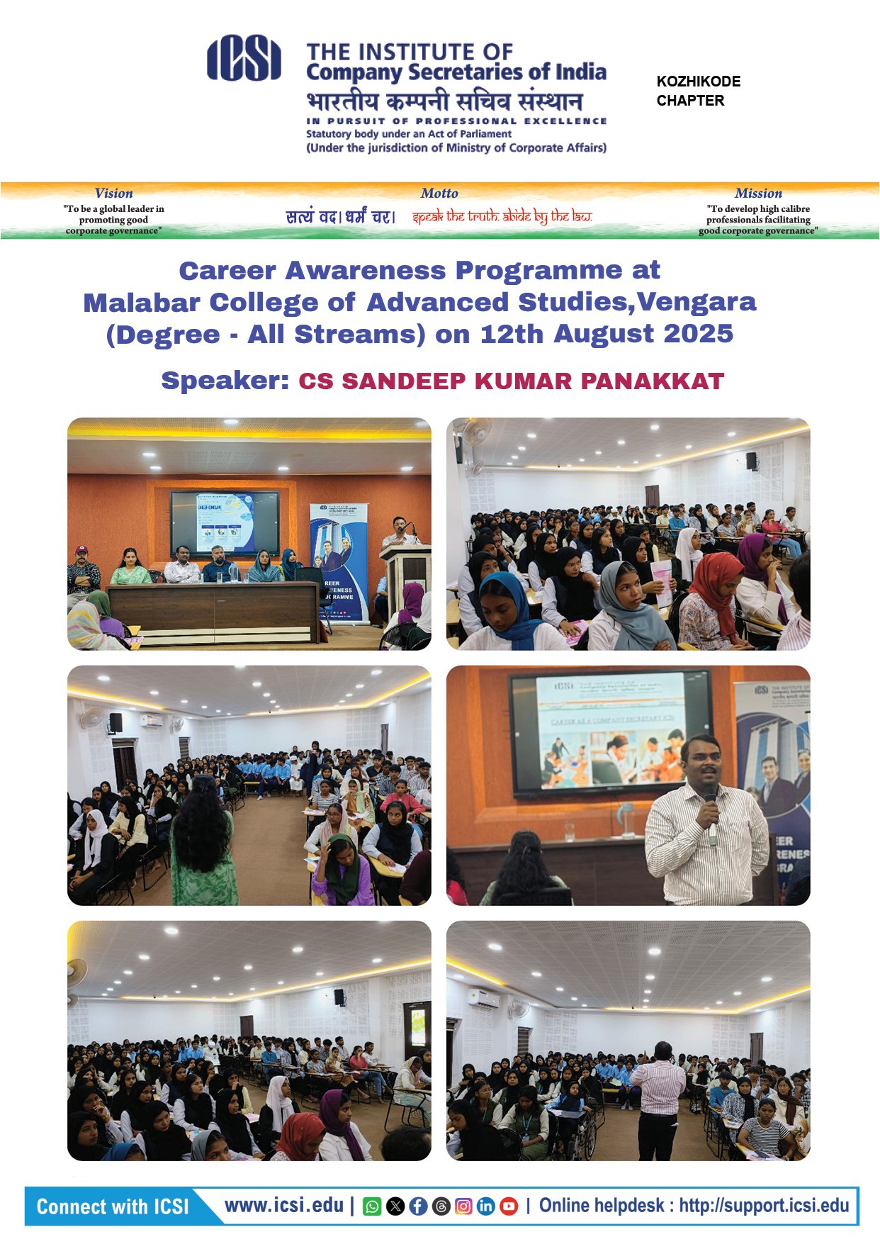 The ICSI Kozhikode Chapter organized a Career Awareness Programme (CAP) at Malabar College of Advanced Studies, Vengara, Malappuram District, on 12th August 2025, as part of its ongoing initiative to promote the Company Secretary (CS) profession among students.