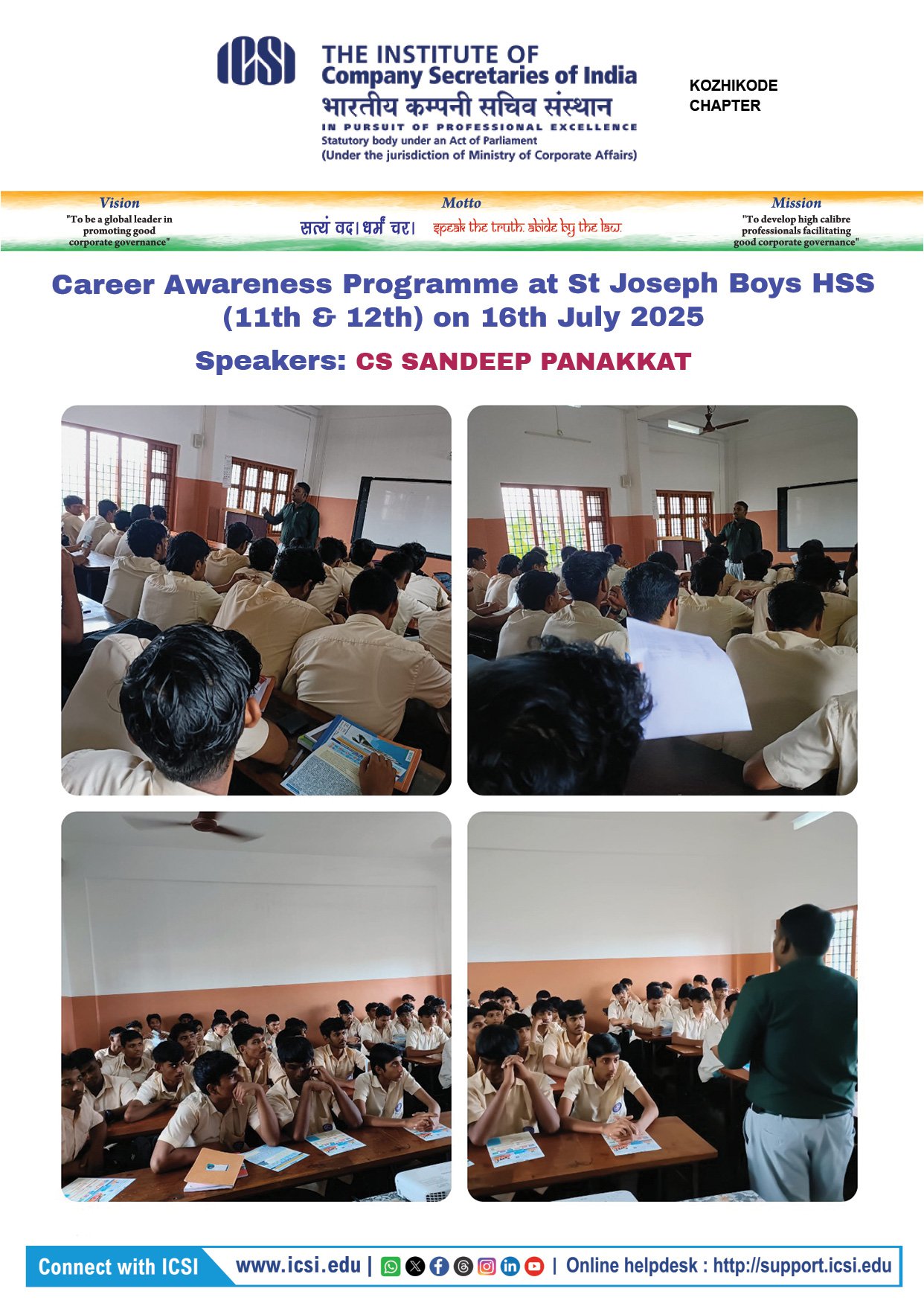As part of Student Month celebrations, the ICSI Kozhikode Chapter successfully conducted a Career Awareness Programme (CAP) at St. Joseph's Boys Higher Secondary School, Kozhikode on July 16, 2025.
