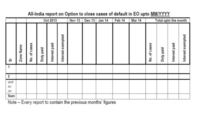 5. Each Chief Commissioner of Customs / Customs (Prev) / Central Excise & Customs shall provide by 3rd of the succeeding month (beginning with report for October 2013 and ending with report for March 2014) a report to the office of Chief Commissioner of Customs Delhi Zone enabling Delhi Customs Zone to prepare and provide a Zone-wise, all-India monthly report to the Board by 5th of every month in the following format: