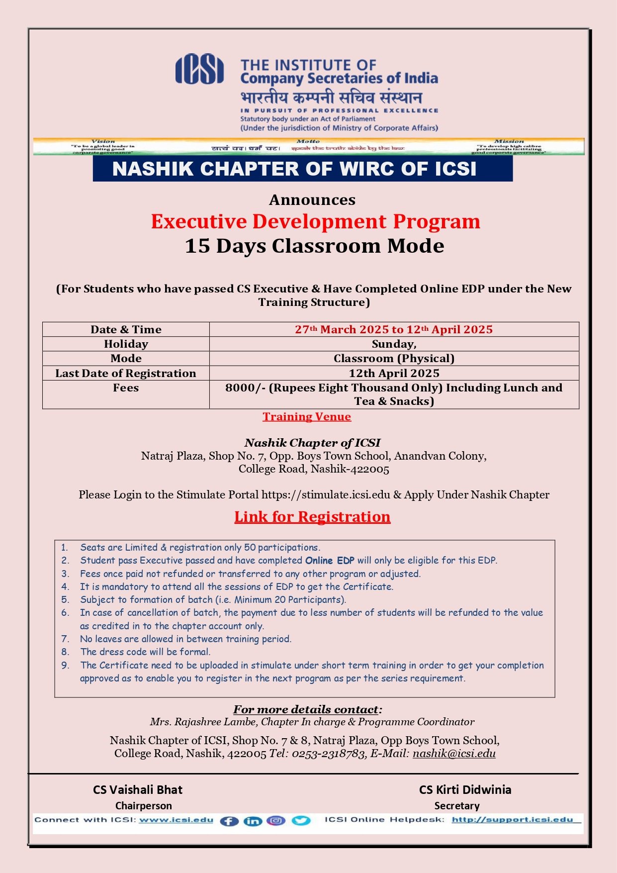 Nashik Chapter of WIRC of ICSI Announces Executive Development Program (EDP)