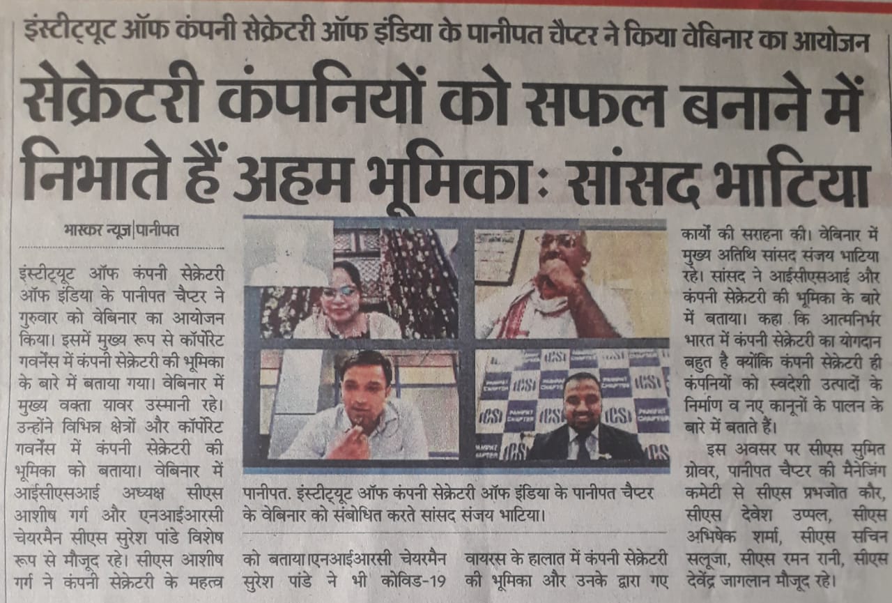 Sh. Sanjay Bhatia (Member of Parliament- Panipat) as a chief guest in the webinar of Panipat chapter on 2nd july, 2020.