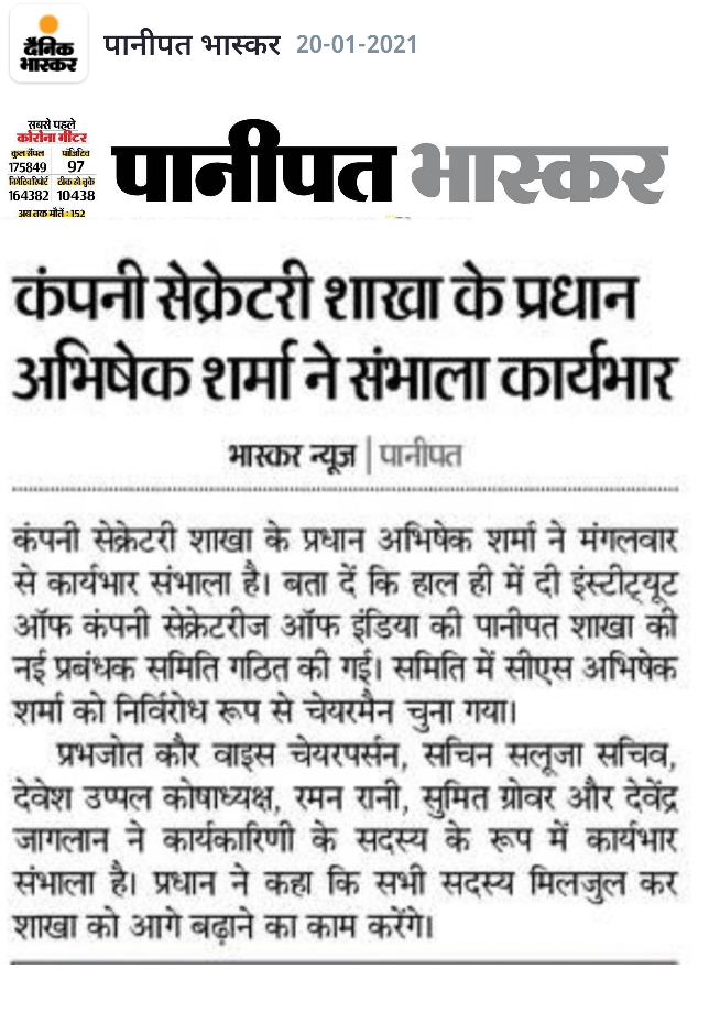 CS Abhishek Sharma Elected as the chairman of Panipat chapter of NIRC of ICSI for the year 2021.