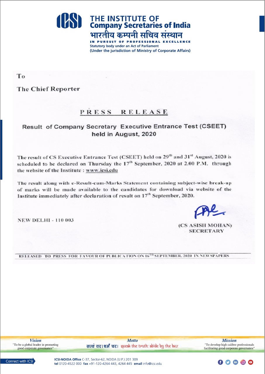 Result of Company Secretary Executive Entrance Test (CSEET) held in August, 2020