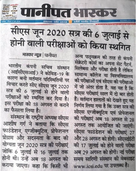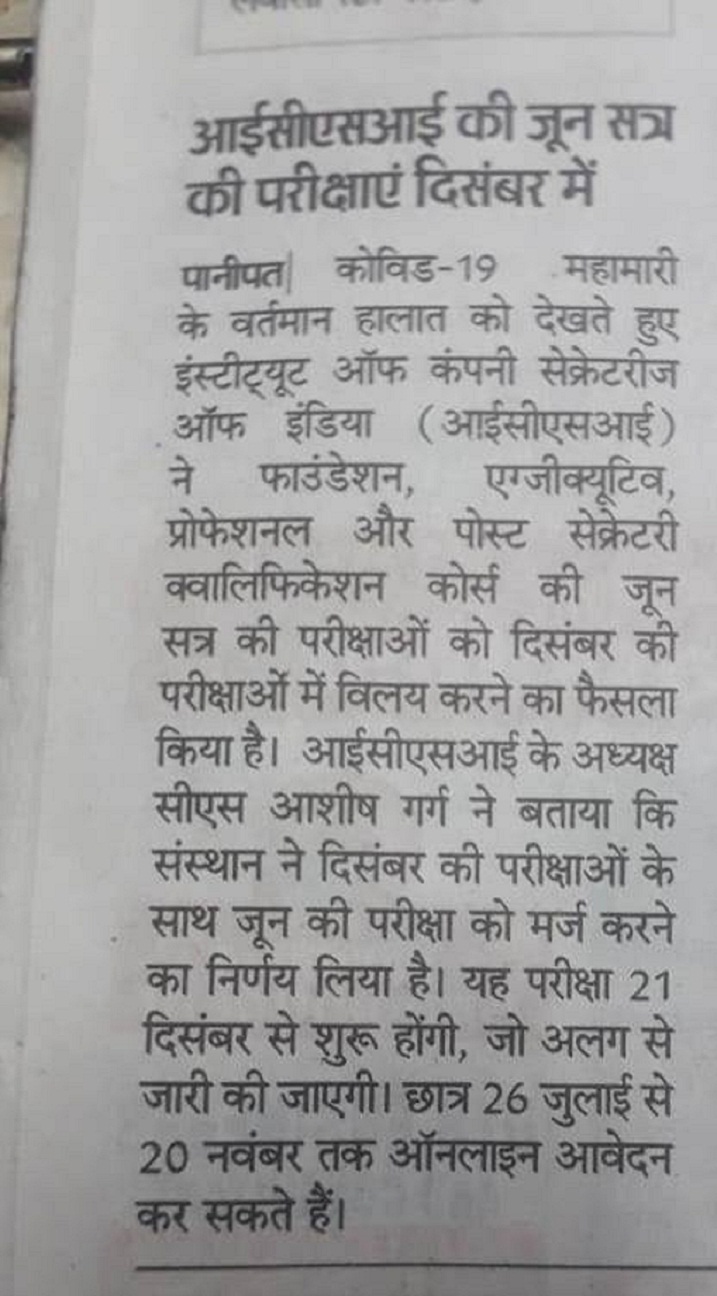 Postponement of June, 2020 Exams- ICSI Examinations for the June 2020 session which has been merged with the December, 2020 Examinations shall commence from 21st December, 2020 as per the Examination Time-table which will be released separately.